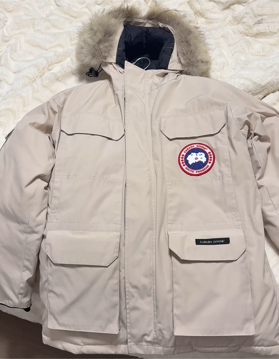 Selling a Canada Goose parka in a lovely beige colour. It features the iconic Canada Goose Arctic Program logo. Perfect for staying warm this winter!