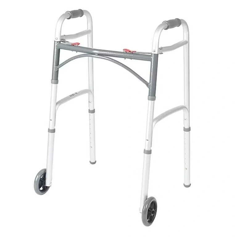 Selling a 2-wheeled walker in silver. It's in great condition and ready to assist with mobility. It features wheels for easy movement and adjustable height settings for a comfortable fit. Perfect for anyone needing a little extra support!