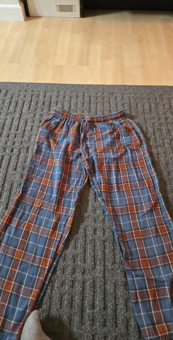 Here are some cozy plaid pajama pants! They feature a blue and orange pattern with a drawstring waist. Perfect for lounging around the house on a chilly day
