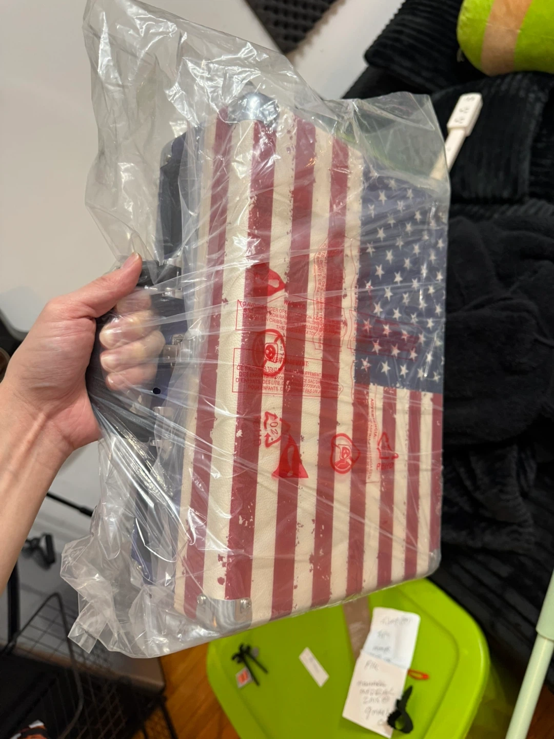 Selling a Victrola Journey Bluetooth Portable Suitcase Record Player in an American Flag design! It has built-in speakers, 3-speed vinyl record player, RCA out, and a headphone jack. Perfect for enjoying your favorite vinyl records on the go