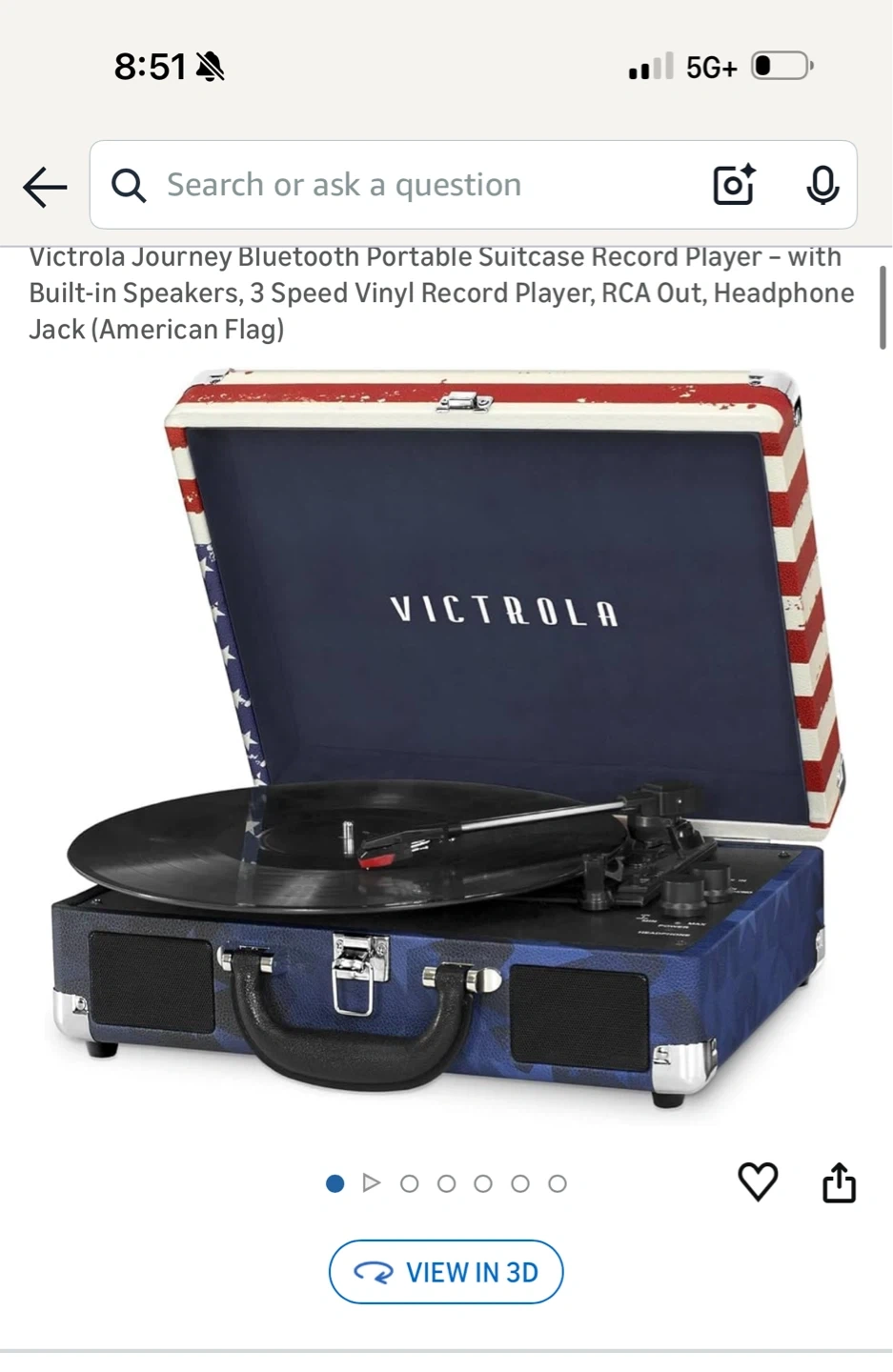 Selling a Victrola Journey Bluetooth Portable Suitcase Record Player in an American Flag design! It has built-in speakers, 3-speed vinyl record player, RCA out, and a headphone jack. Perfect for enjoying your favorite vinyl records on the go