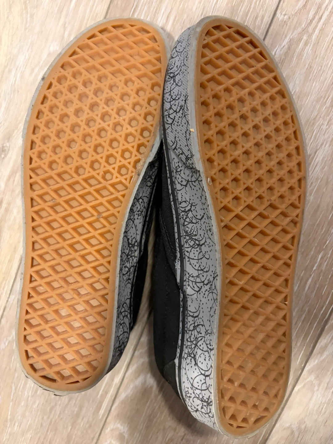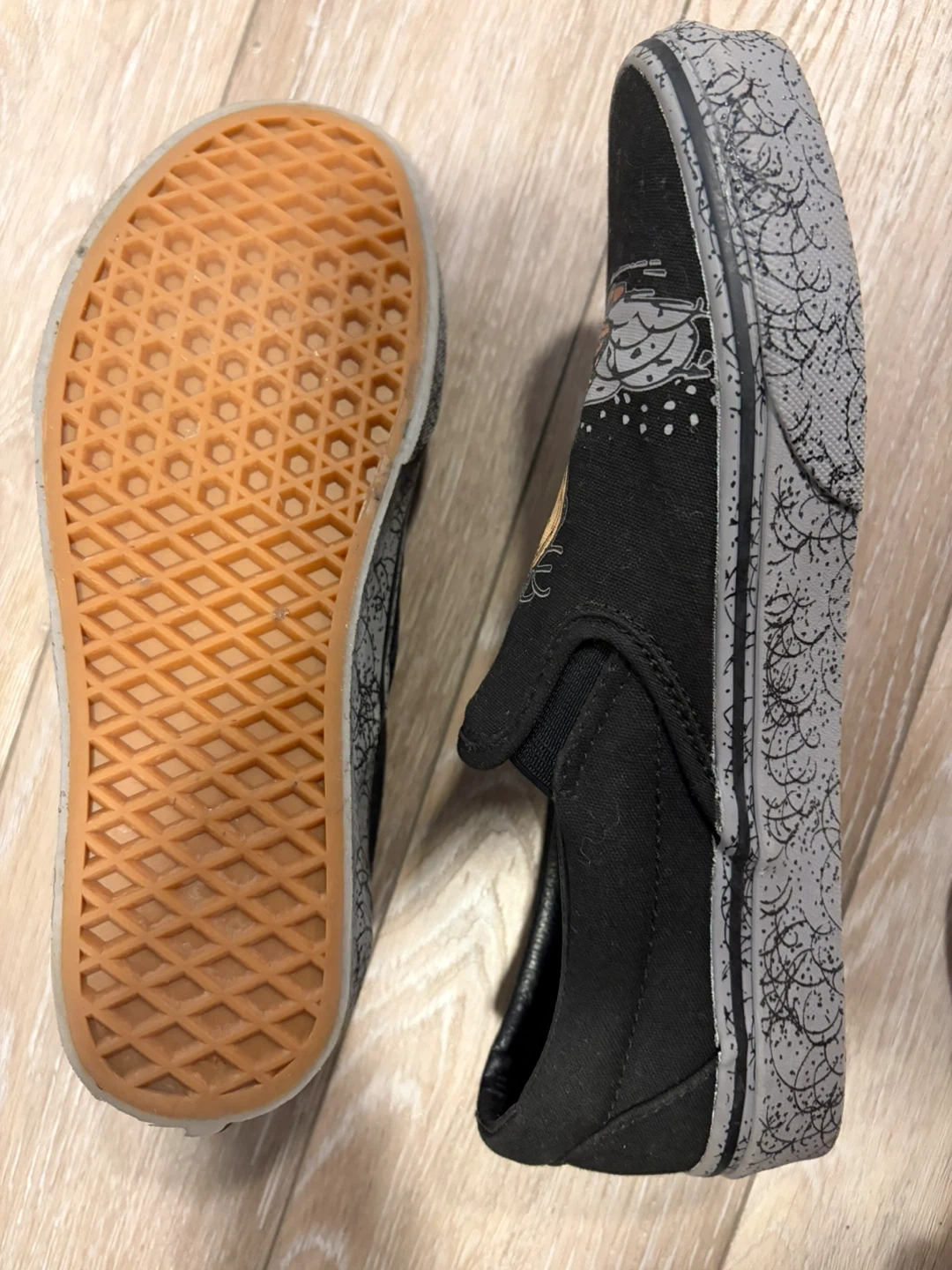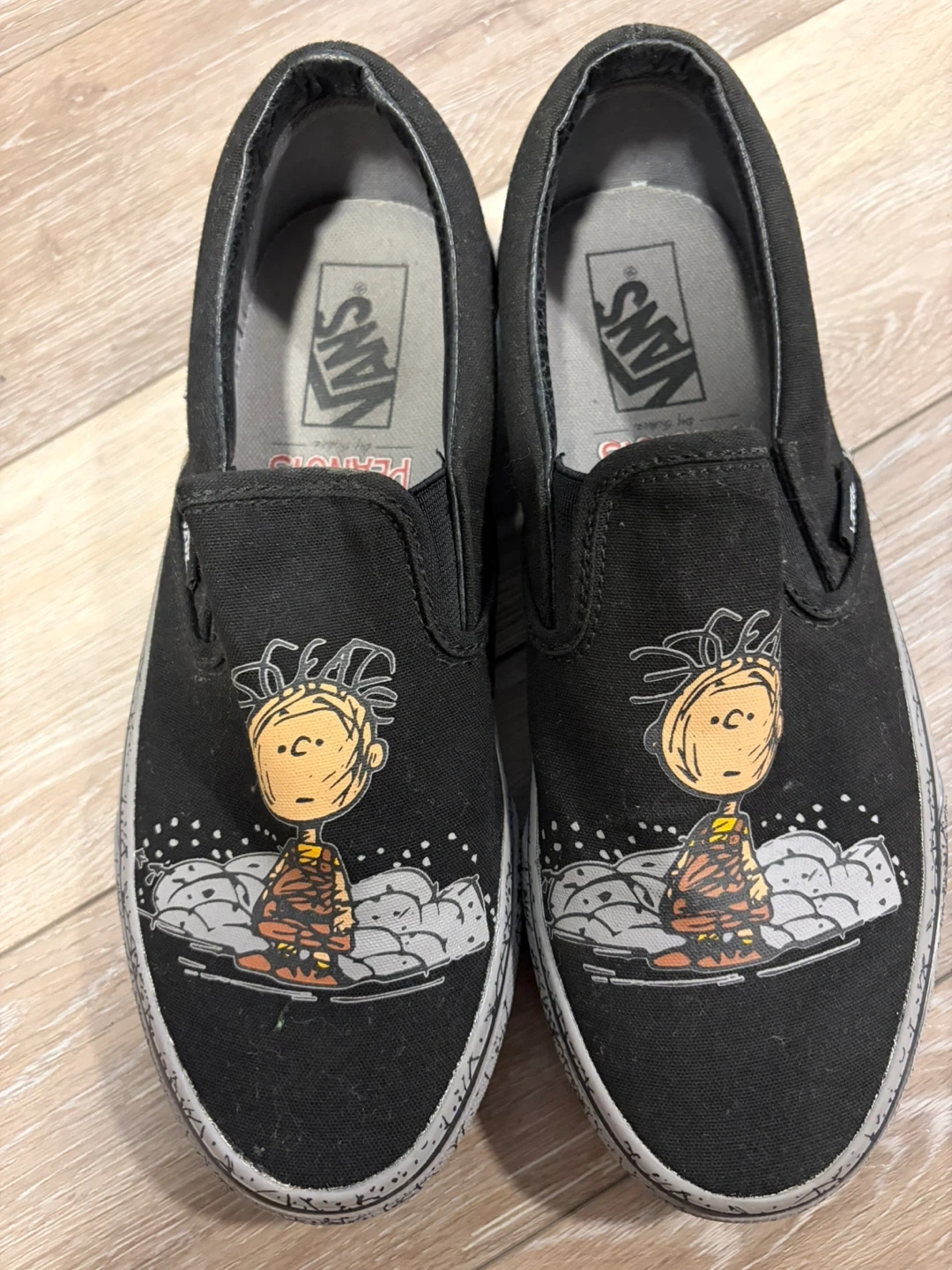 Selling a pair of Vans slip-on shoes featuring a Peanuts design! They're in good condition and ready for a new owner. The shoes are black with a Charlie Brown graphic on the front and a patterned grey sole. Size 7.