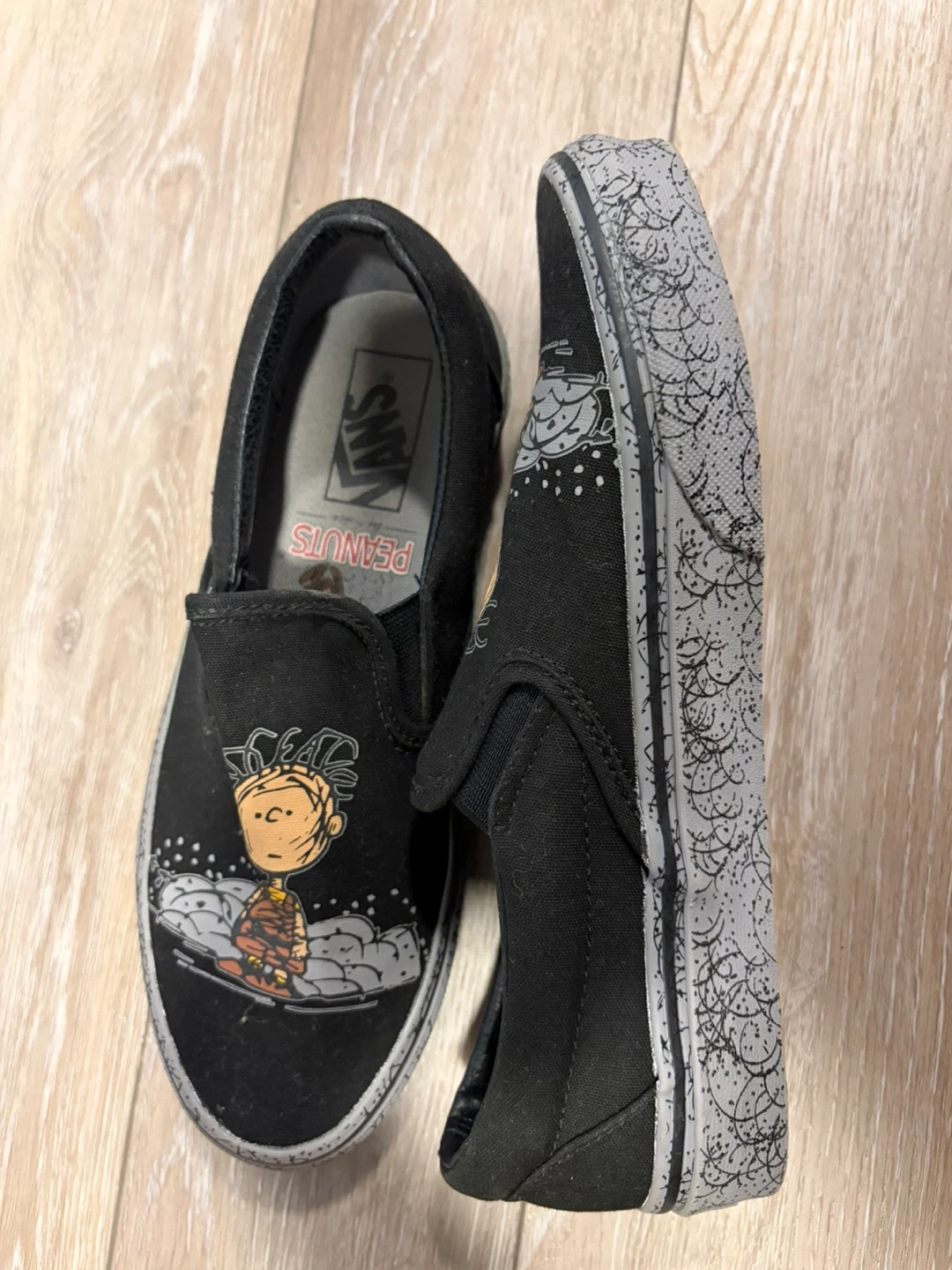 Selling a pair of Vans slip-on shoes featuring a Peanuts design! They're in good condition and ready for a new owner. The shoes are black with a Charlie Brown graphic on the front and a patterned grey sole. Size 7.