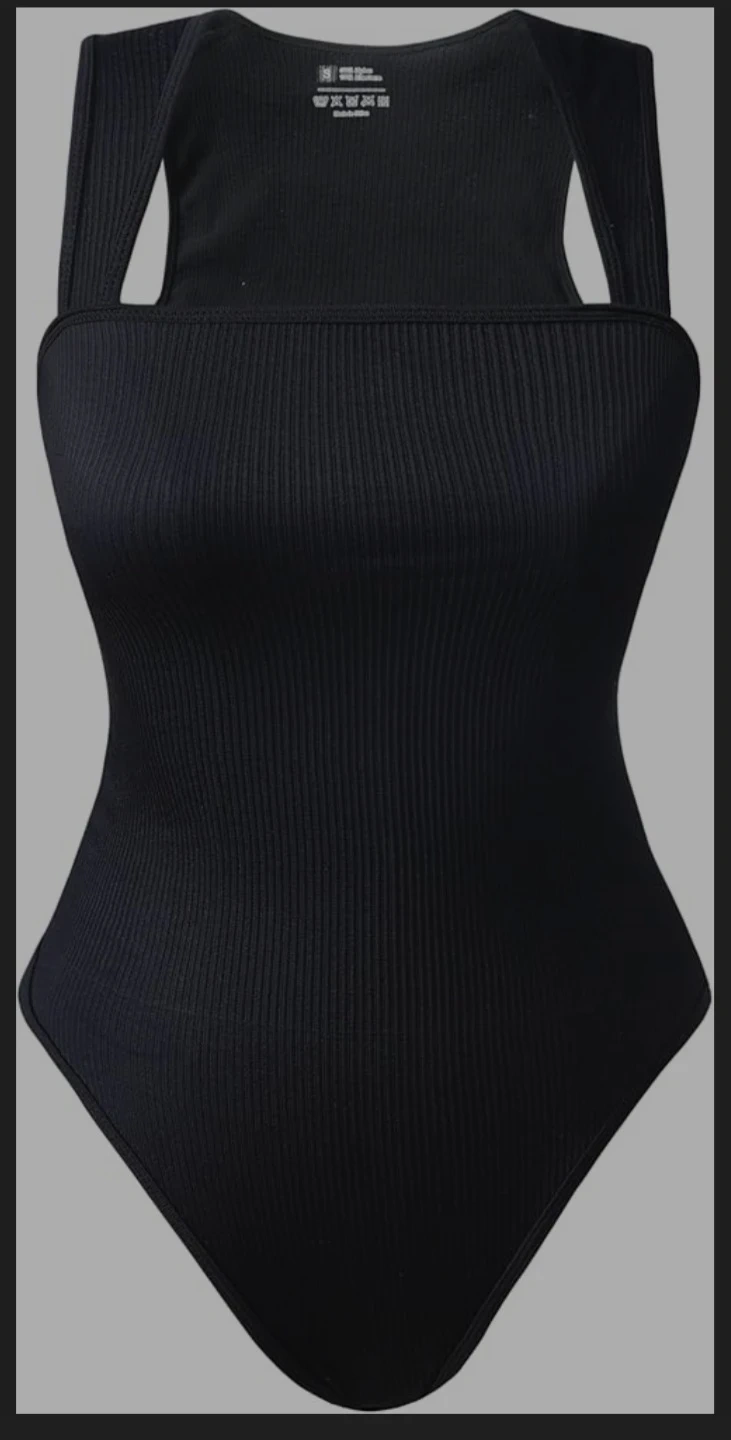 Here's a stylish black ribbed bodysuit that's perfect for layering or wearing on its own! It's in great condition and ready for a new wardrobe