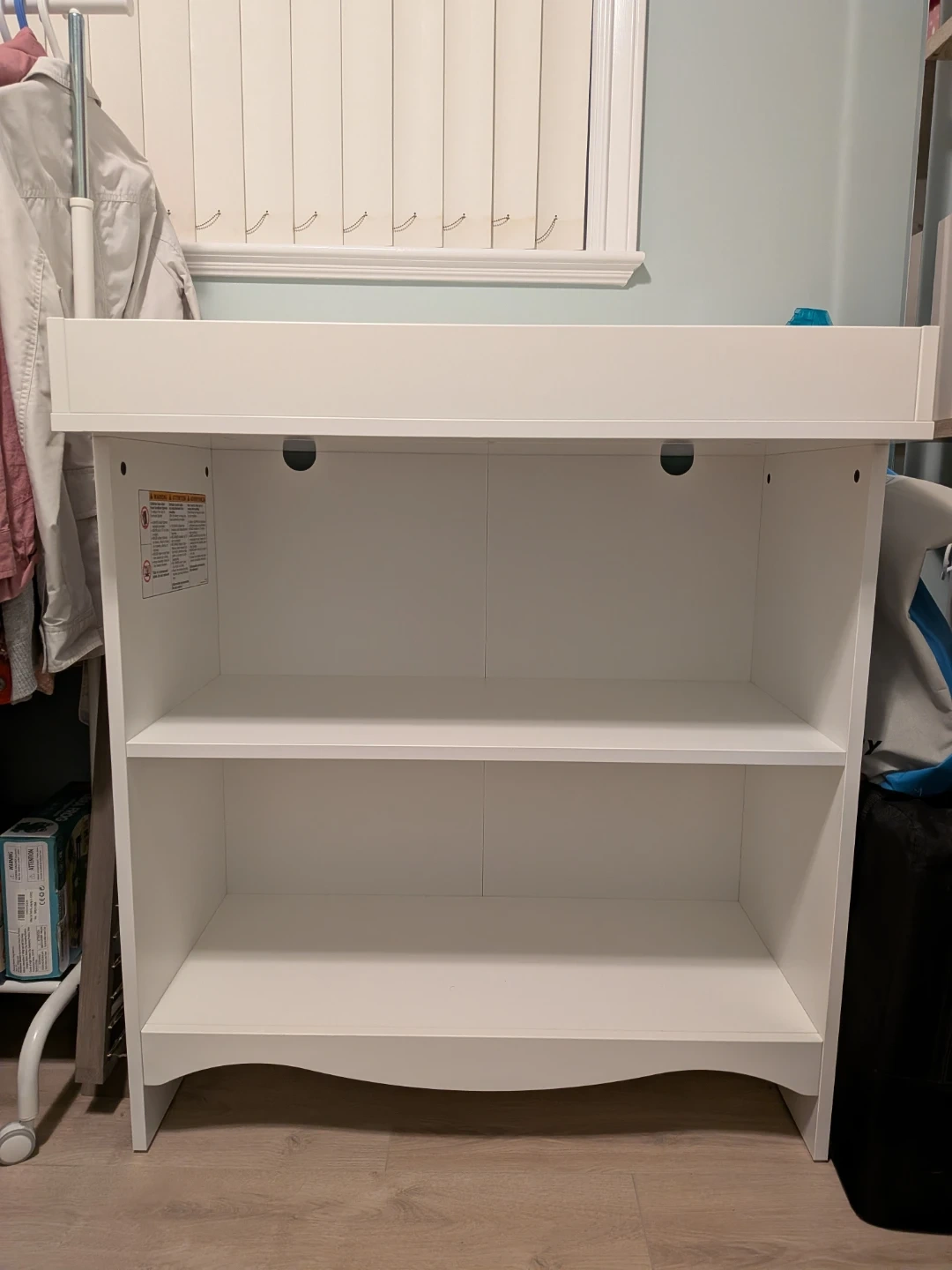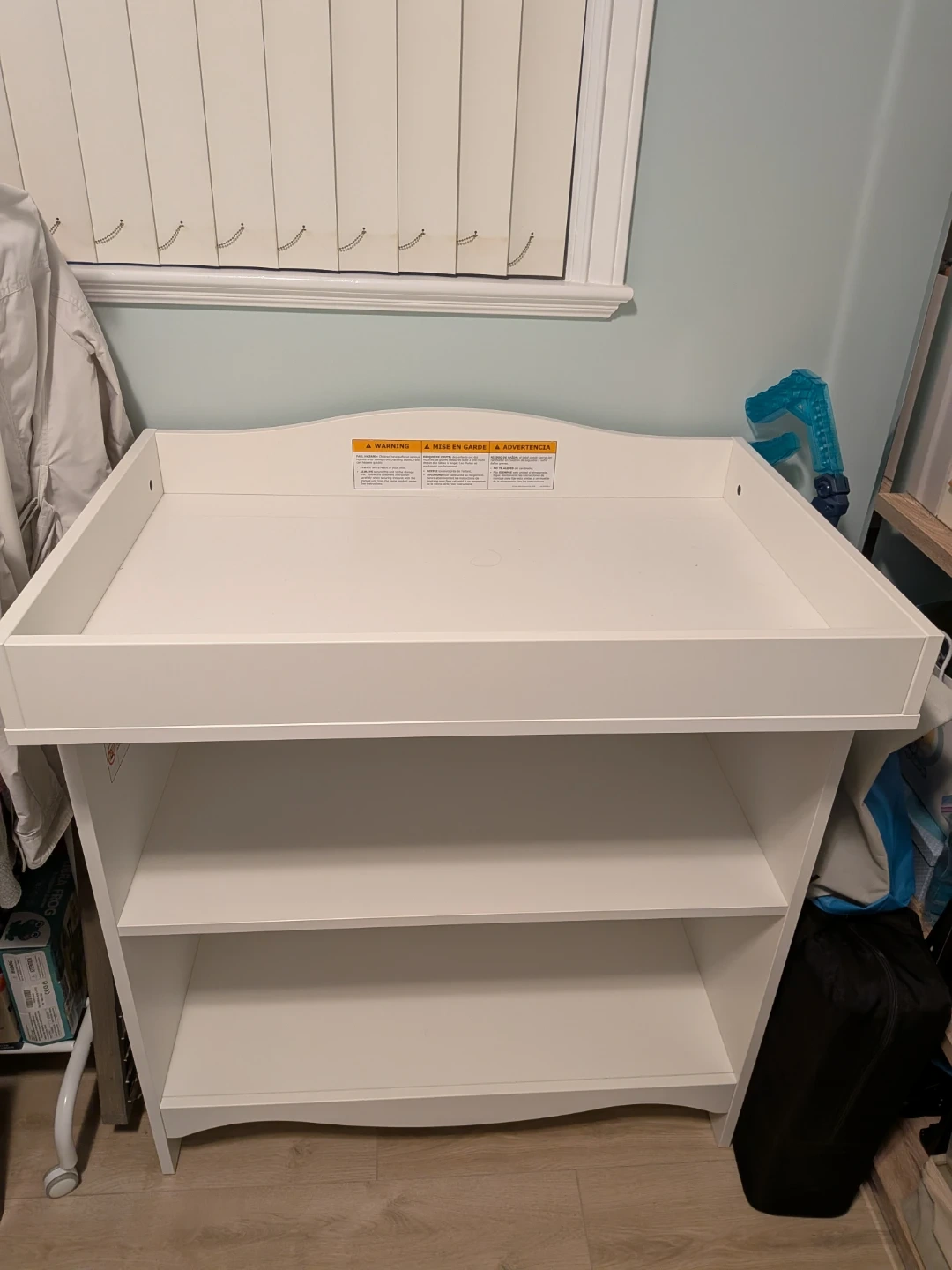 Selling a white IKEA SMÅGÖRA changing table. It has a sturdy design with shelves for storage, making diaper changes a breeze. The top provides a safe and comfortable space for your little one. Perfect for keeping all your baby essentials organized and within reach.
