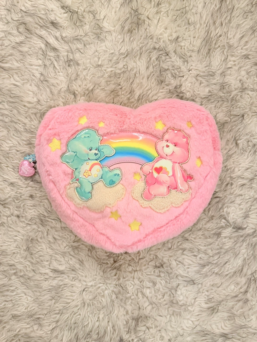 This backpack has a soft faux fur construction, a heart shape, patent vegan leather Care Bears appliques, embroidered stars, inner pockets, a hood with bear ears and a printed satin lining that can be rolled down into the zipper compartment on top, adjustable and removable glitter shoulder straps, and a zip closure with a Care Bears keychain charm.