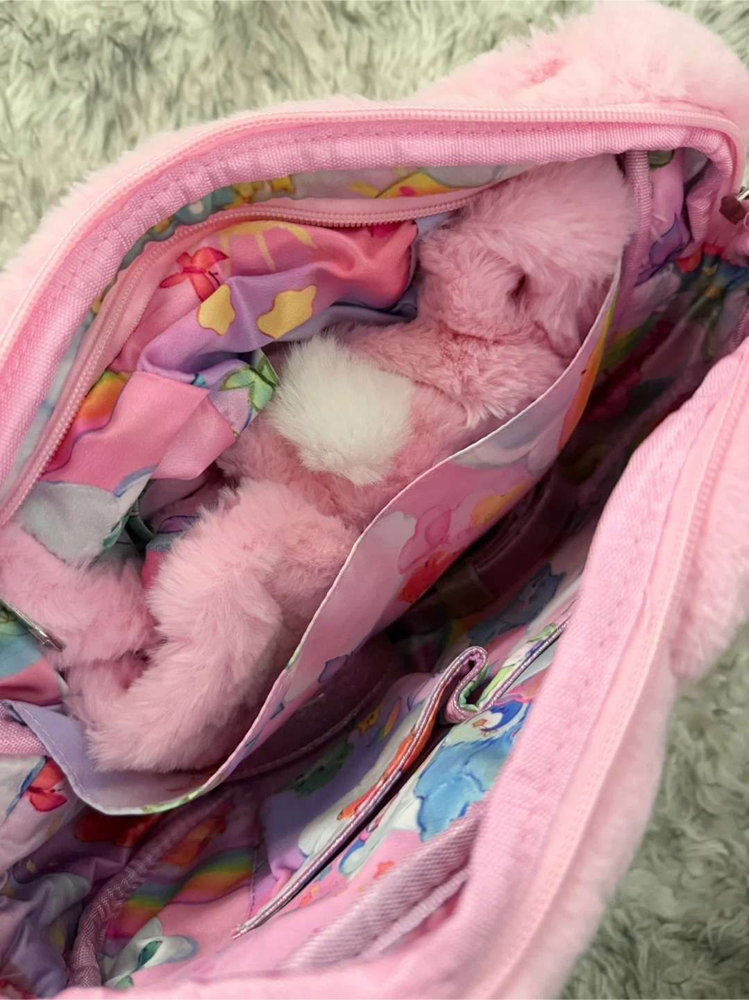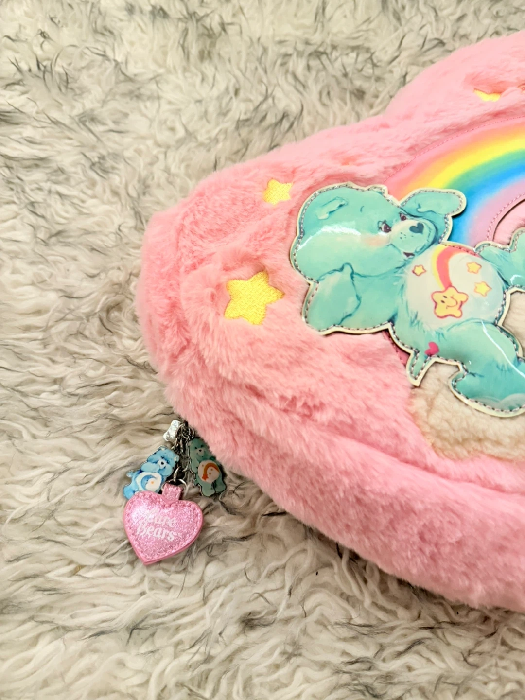 This backpack has a soft faux fur construction, a heart shape, patent vegan leather Care Bears appliques, embroidered stars, inner pockets, a hood with bear ears and a printed satin lining that can be rolled down into the zipper compartment on top, adjustable and removable glitter shoulder straps, and a zip closure with a Care Bears keychain charm.