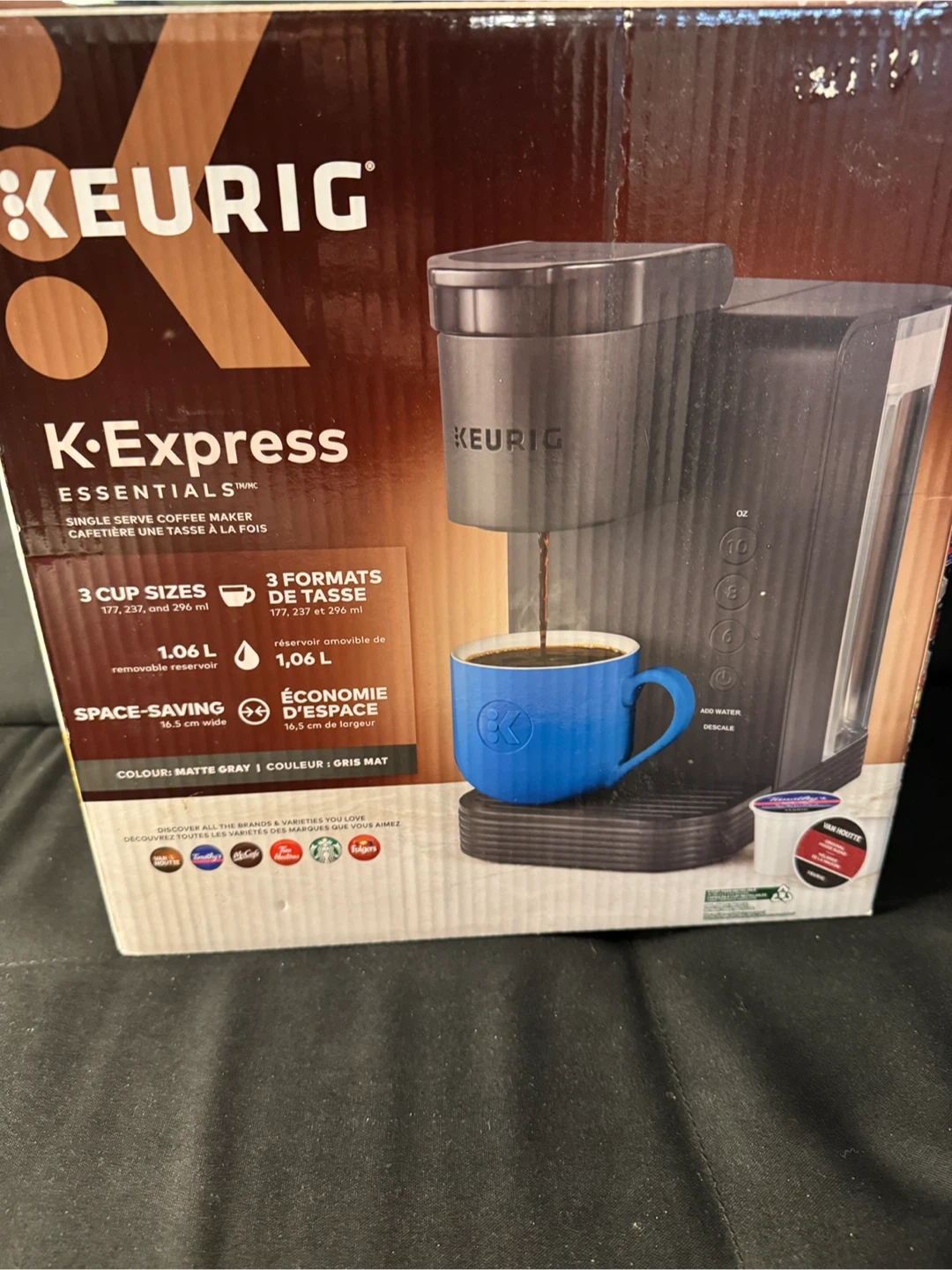 I'm selling a Keurig K-Express Essentials single serve coffee maker! It is space-saving at 16.5 cm wide and has 3 cup sizes: 177, 237, and 296 ml. The box is included! Barely used.