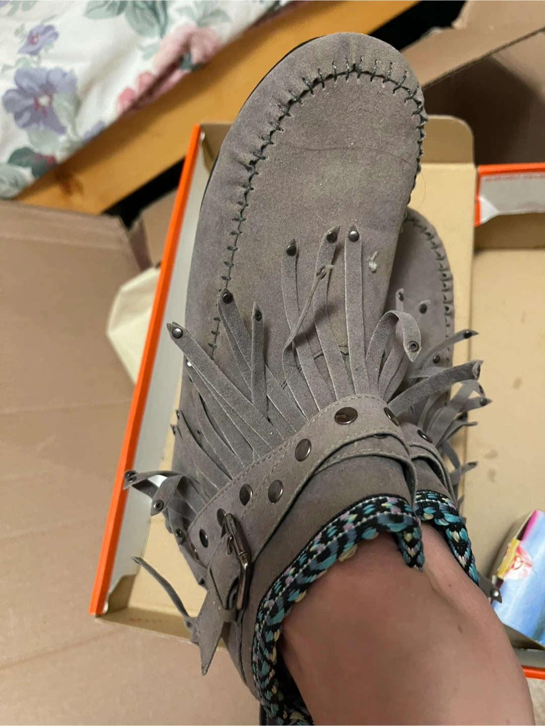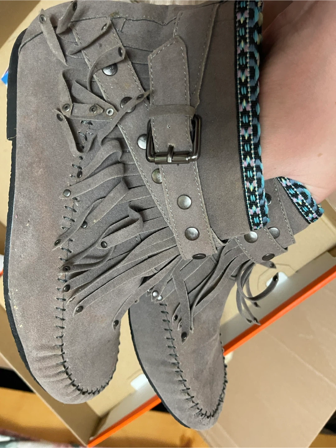 Selling size 7 moccasin-style boots. They're a light brown/grey colour and have some cute fringe detailing. They come with a buckle strap and a colourful patterned trim. These boots are super comfy and stylish!