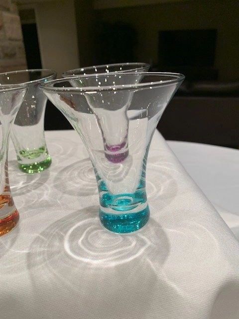Glasses with a controlled colour bubble in the base of each glass