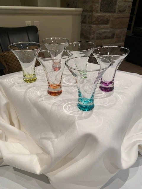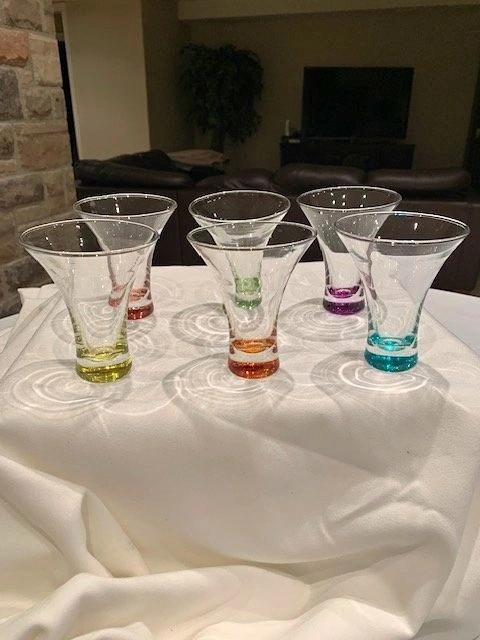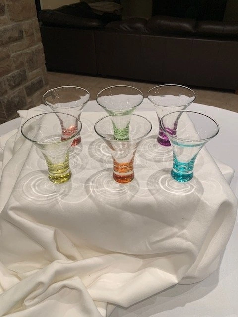 Glasses with a controlled colour bubble in the base of each glass