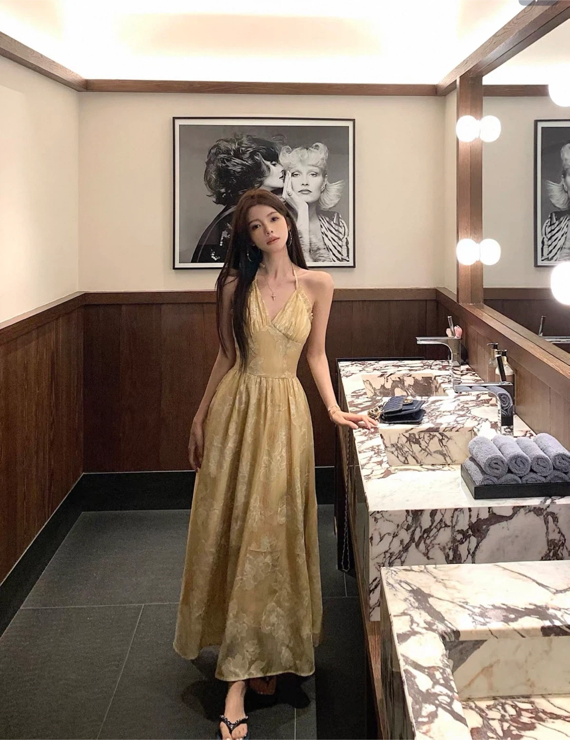 Selling a beautiful maxi dress with a delicate floral pattern! The dress is a gold colour and features a halter neckline. Perfect for a special occasion or a night out