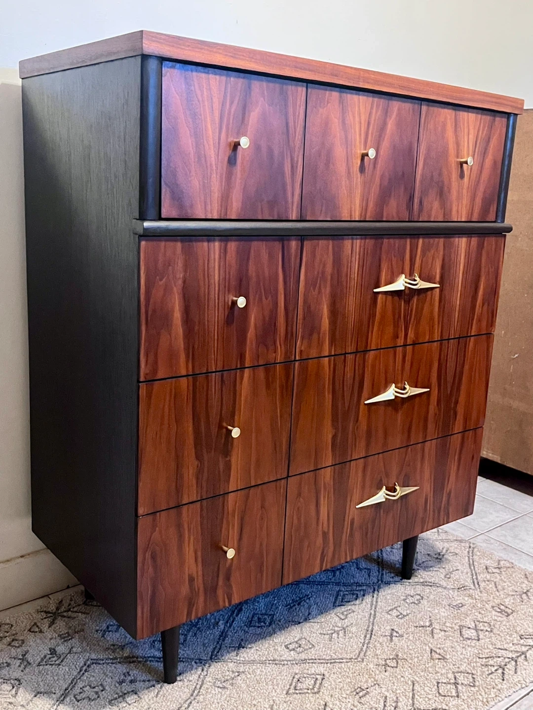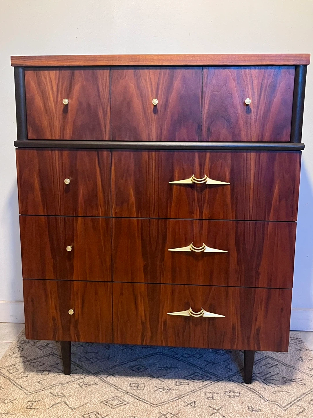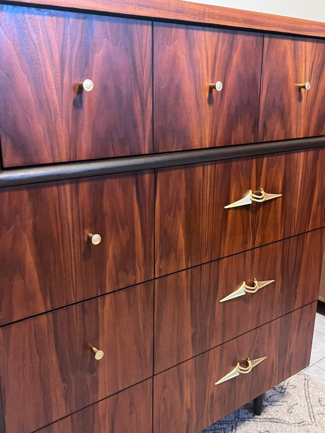 True Mid Century 4 drawer dresser! Fun atomic original handles smooth walnut fronted drawers! handsome and timeless piece 👌🏼 firm price cash only please.