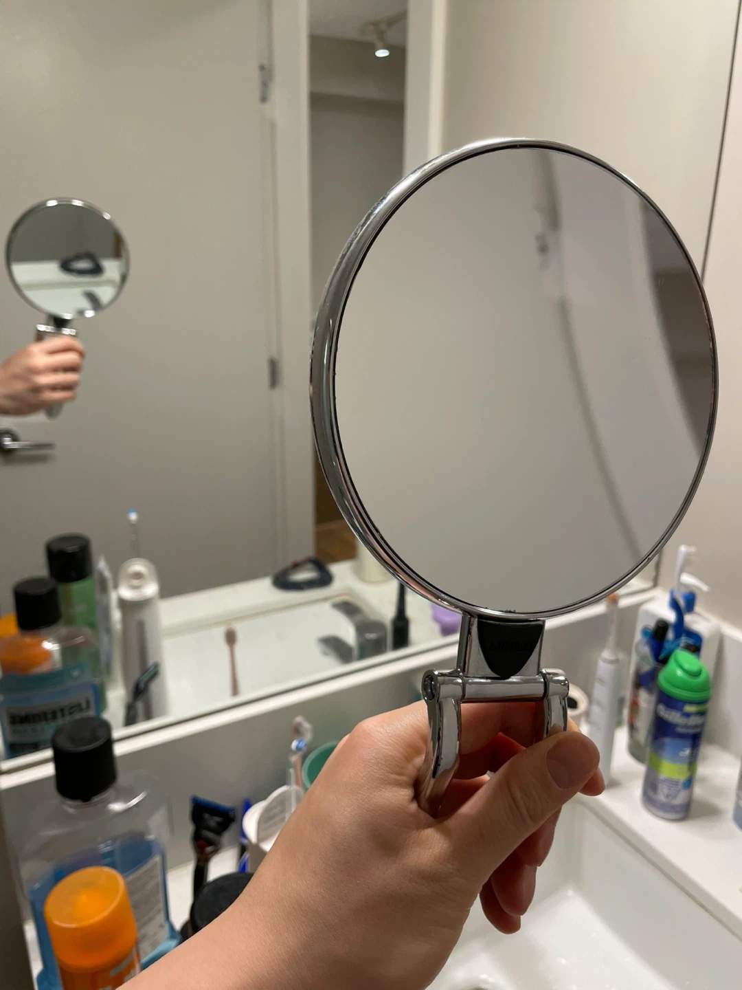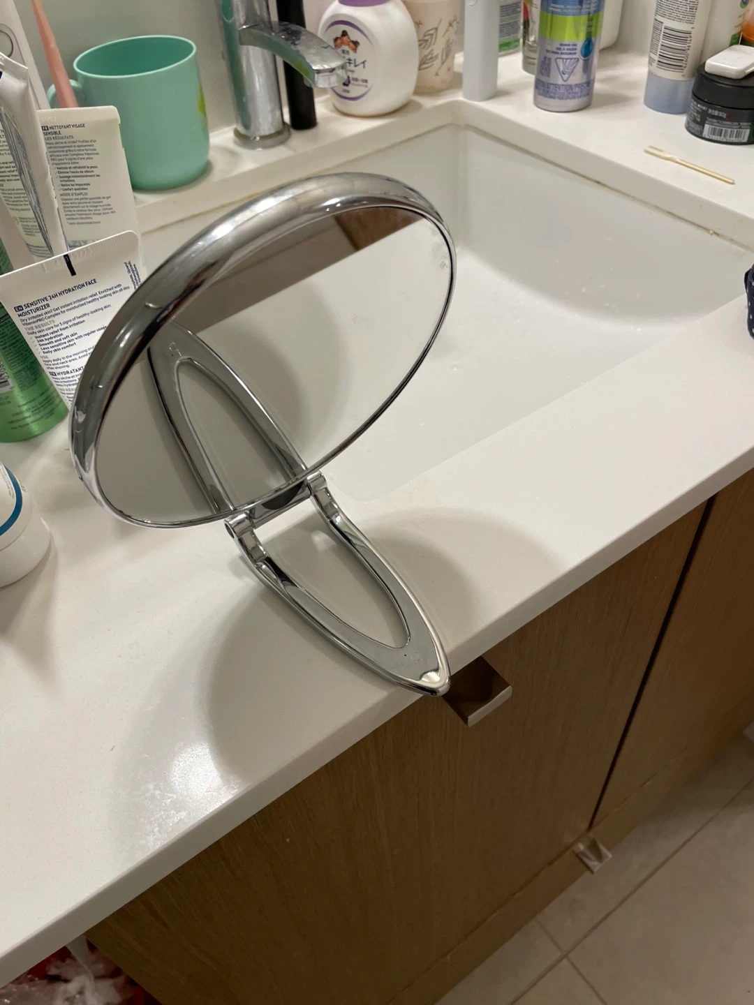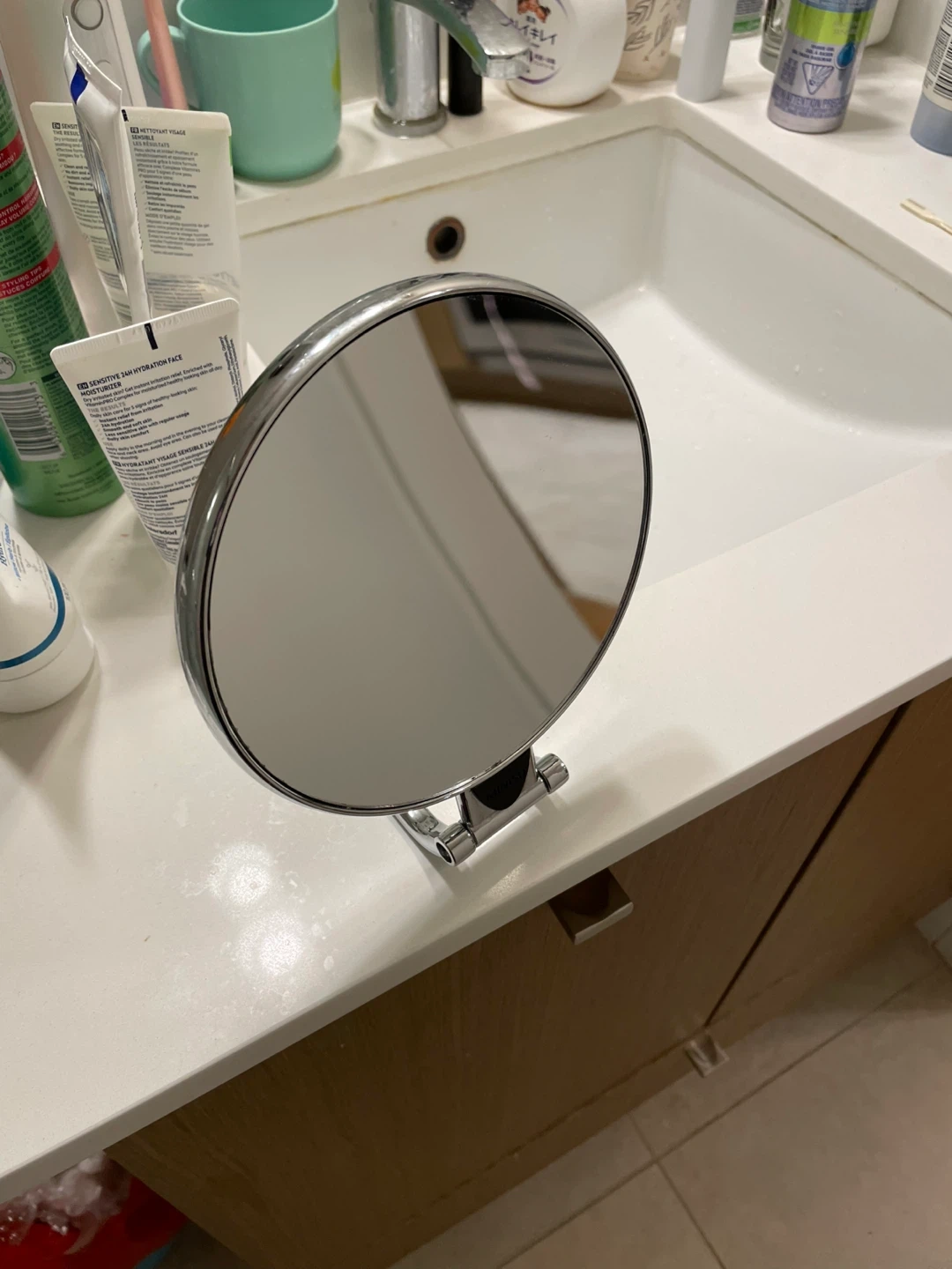 Selling a chrome vanity makeup mirror. It's in great shape and perfect for getting ready in the morning or doing your skincare routine. The mirror is round and has a stand, making it easy to use on any countertop or vanity