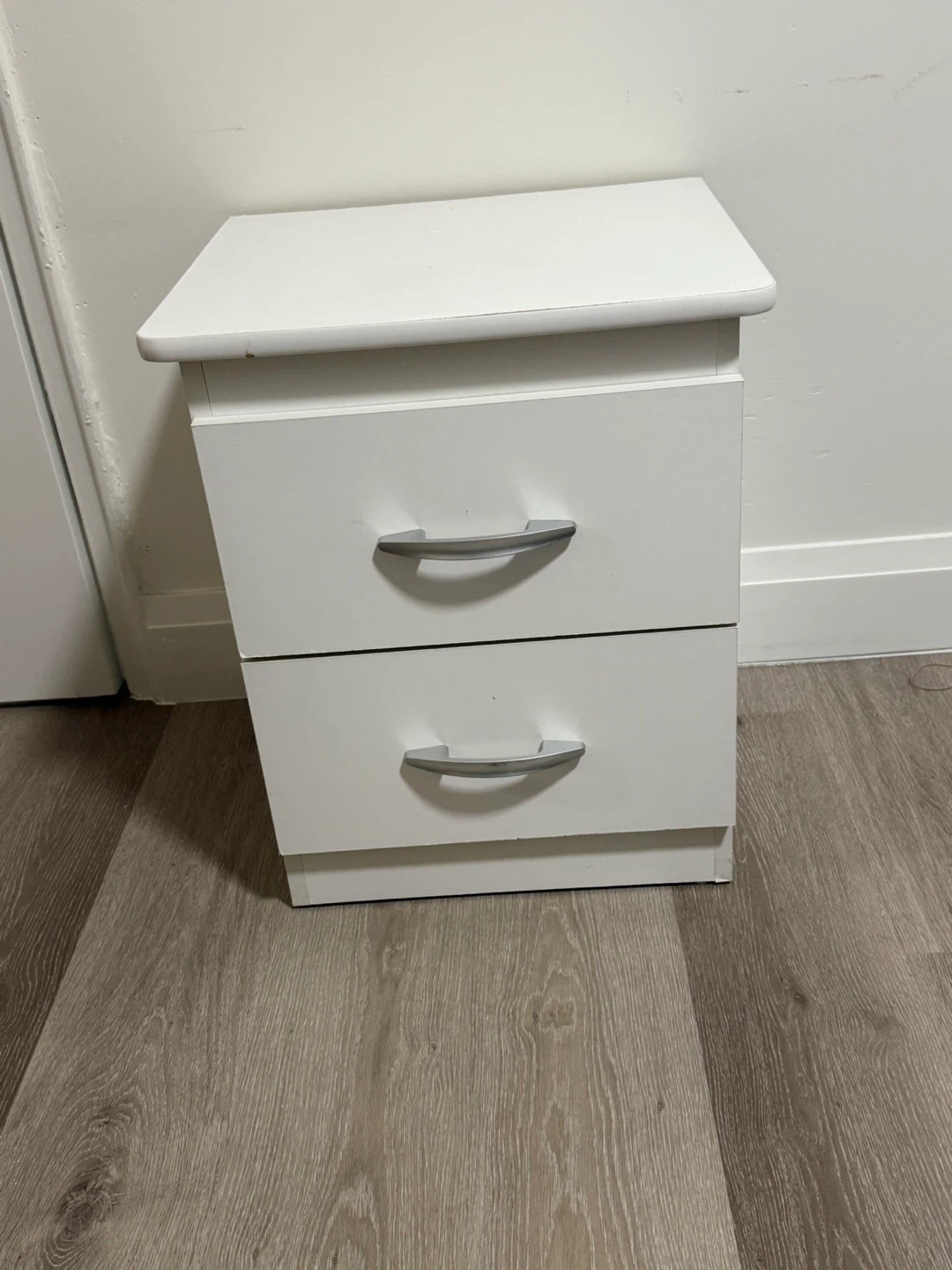 Selling a white nightstand with two drawers. It's perfect for keeping your bedside essentials organized and within easy reach. It has a clean and simple design that will fit well with any bedroom decor. It's in good condition and ready for a new home!