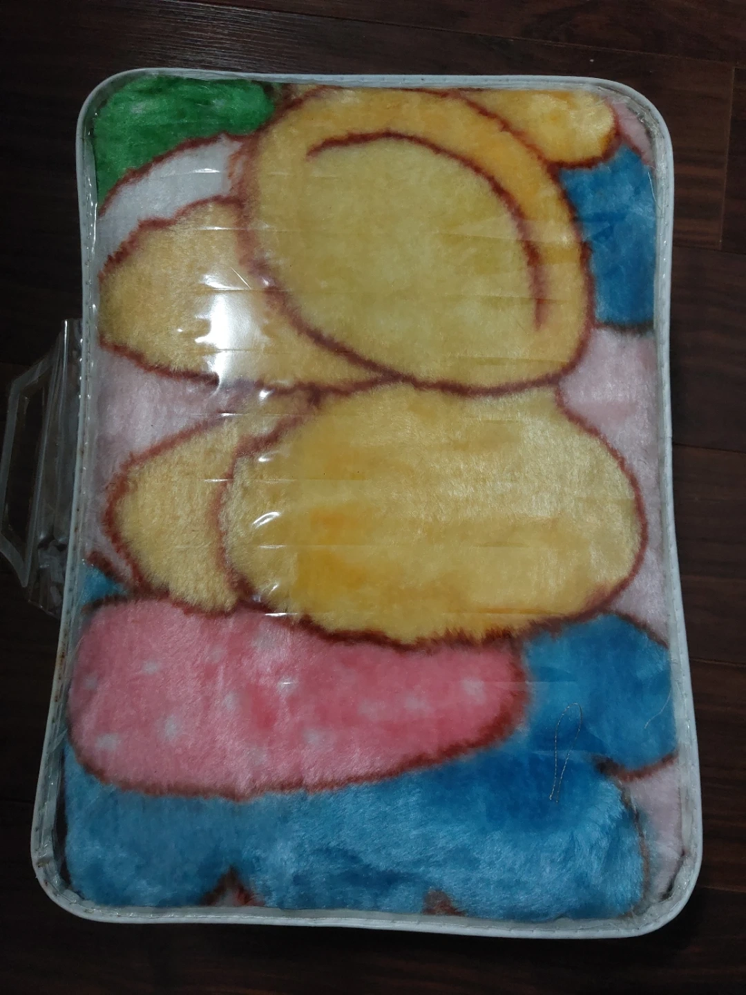 Selling a baby blanket. It's super soft and cozy, perfect for keeping your little one warm. The blanket features a cute design in pink, yellow, and blue colours.