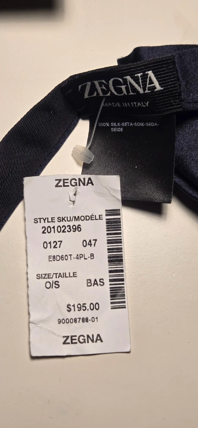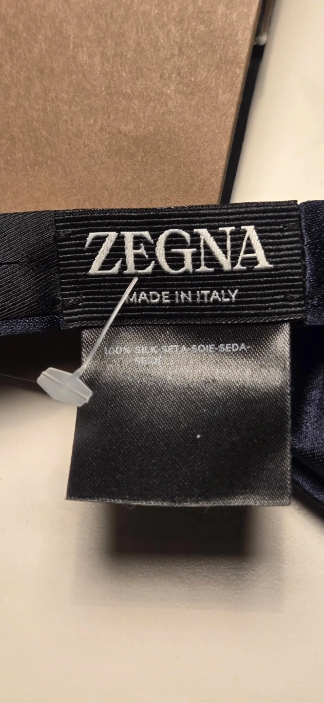 Here's a brand new with tags Zegna bow tie! It's made in Italy from 100% silk and comes in a classic navy colour. Originally bought for $195 and comes with the Harry Rosen bag!