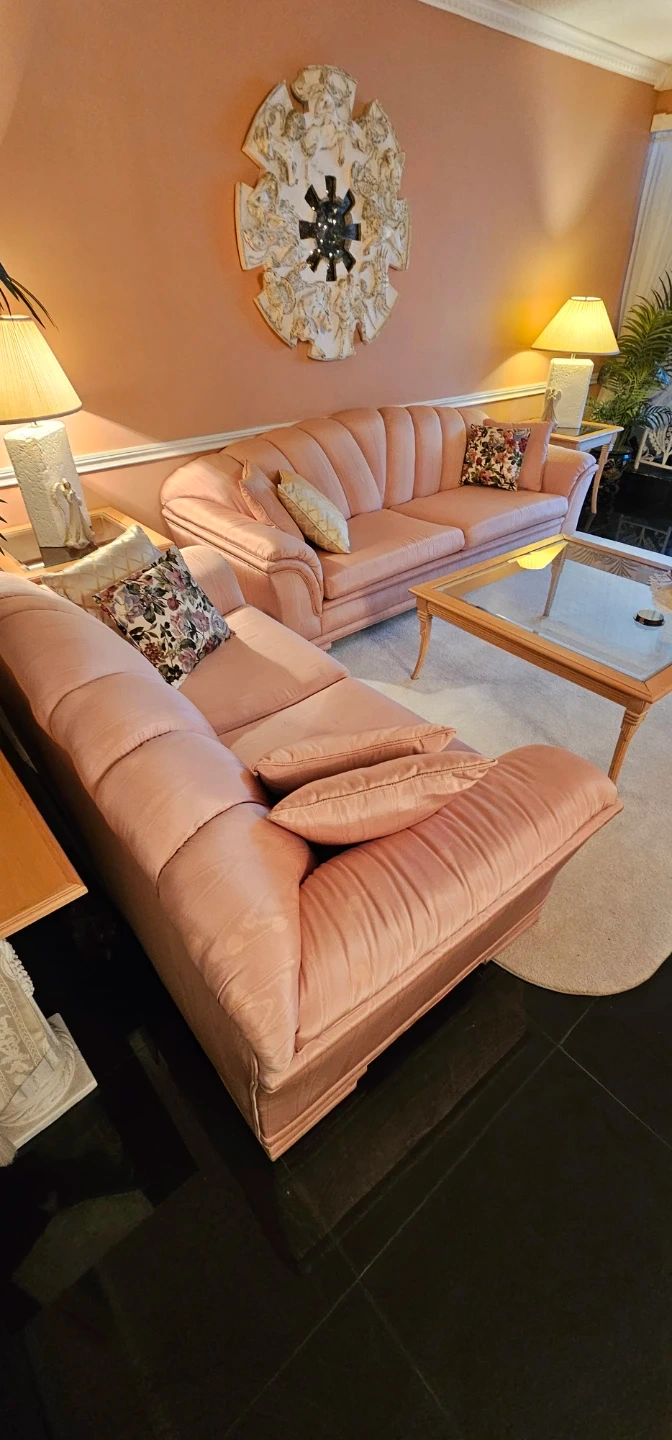Selling a beautiful vintage sectional sofa set in a lovely shade of pink. This set includes a sofa and loveseat, perfect for adding a touch of retro charm to your living room. The unique design and comfortable cushions make it a great addition to any home. Pillows are included!