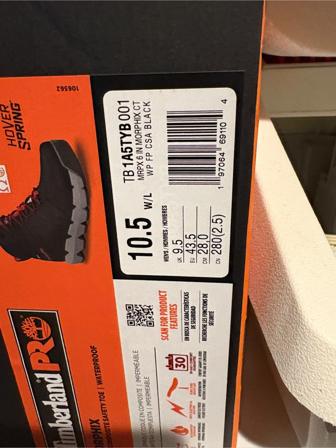 Selling a pair of Timberland PRO Morphix 6" Composite Safety Toe Waterproof boots in size 10.5. These boots are black and feature a composite safety toe for protection and Hover Spring technology for comfort. They are waterproof, making them suitable for various work conditions. The box is included!