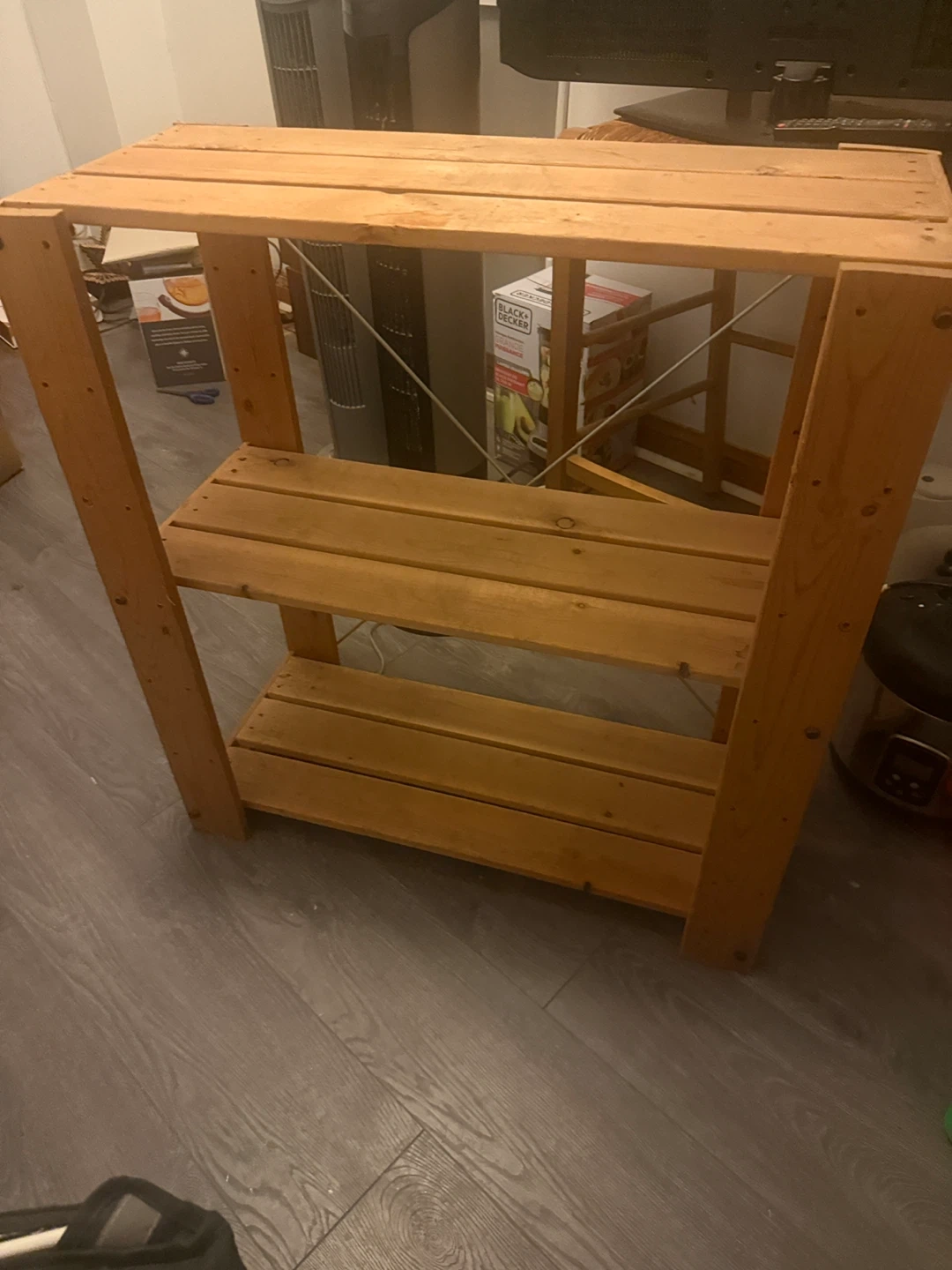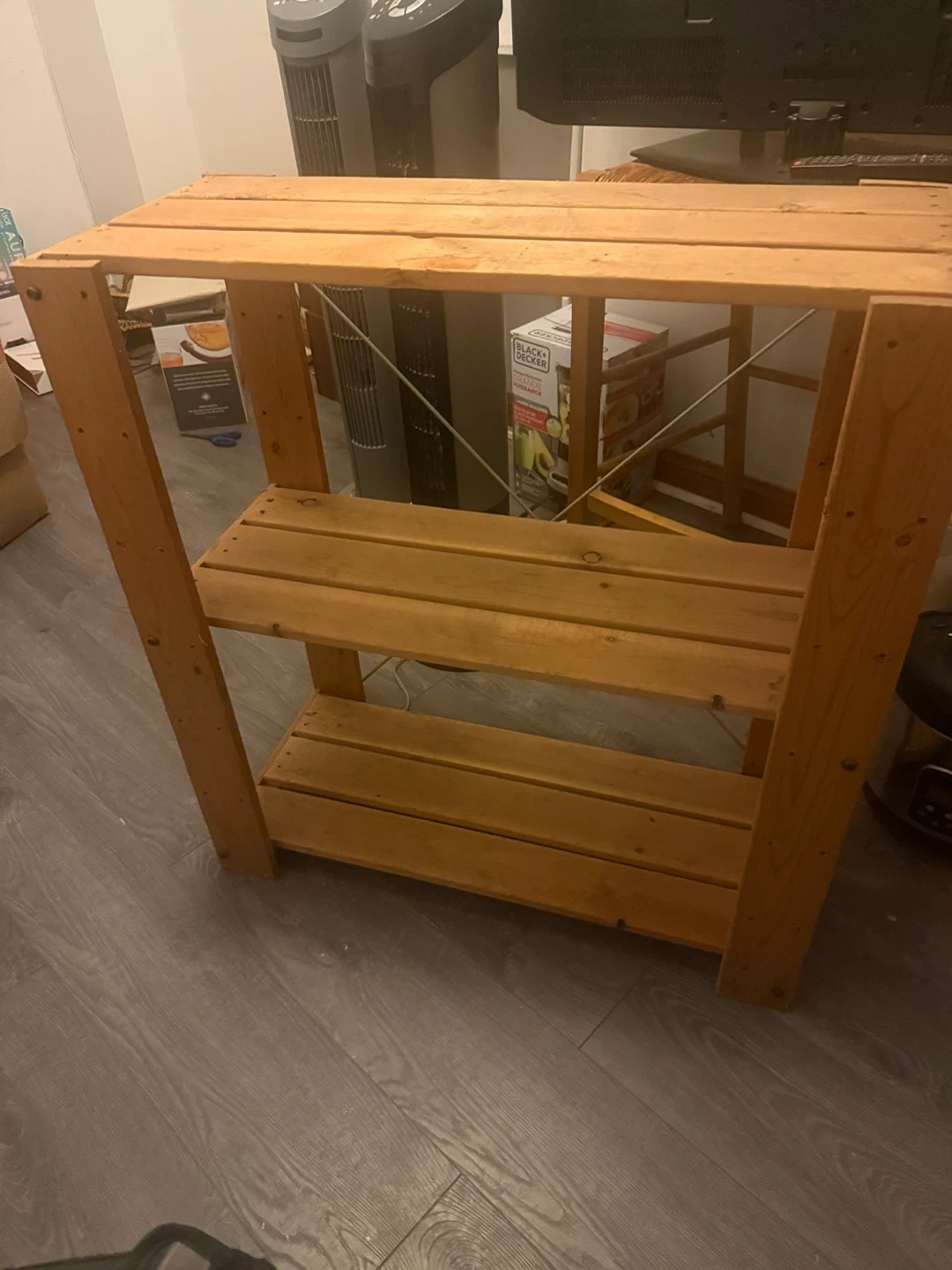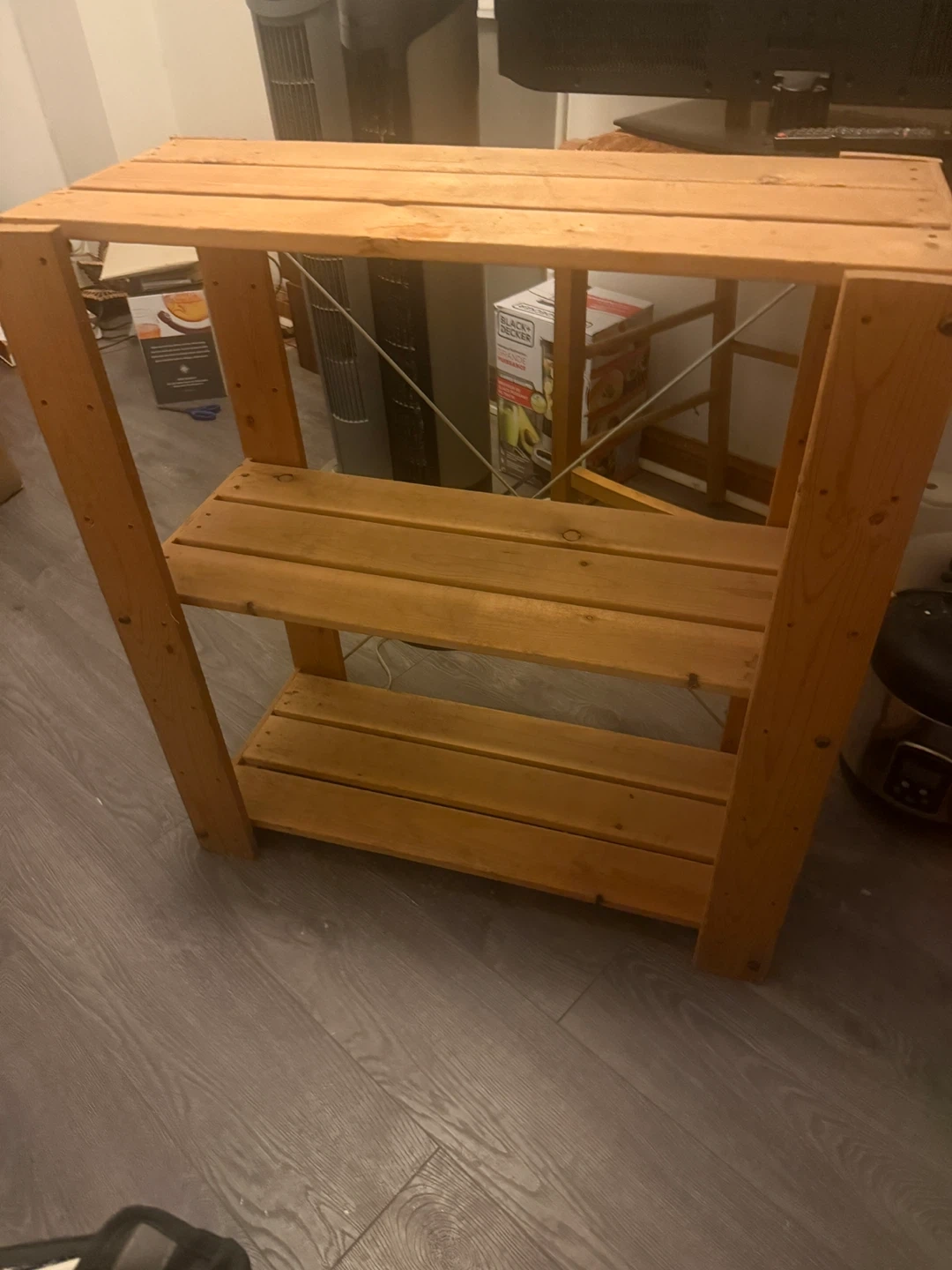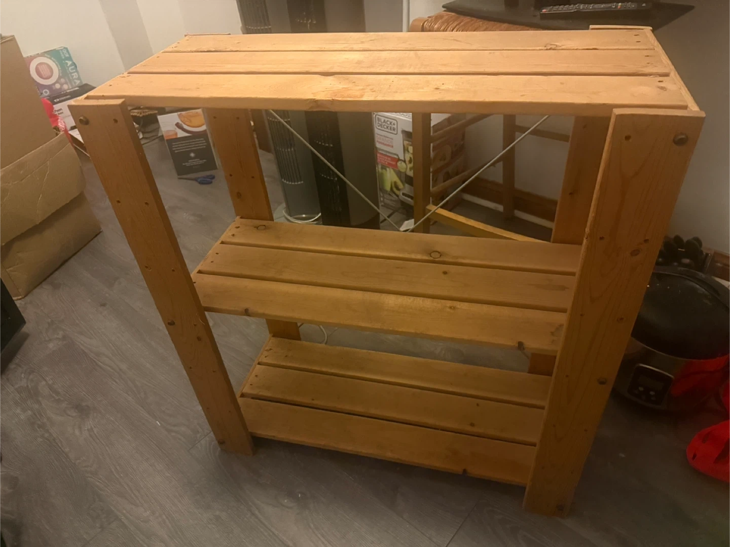 Here's a sturdy wooden shelf unit, perfect for organizing your space! It has three shelves and a simple, rustic design. Great for storage or display