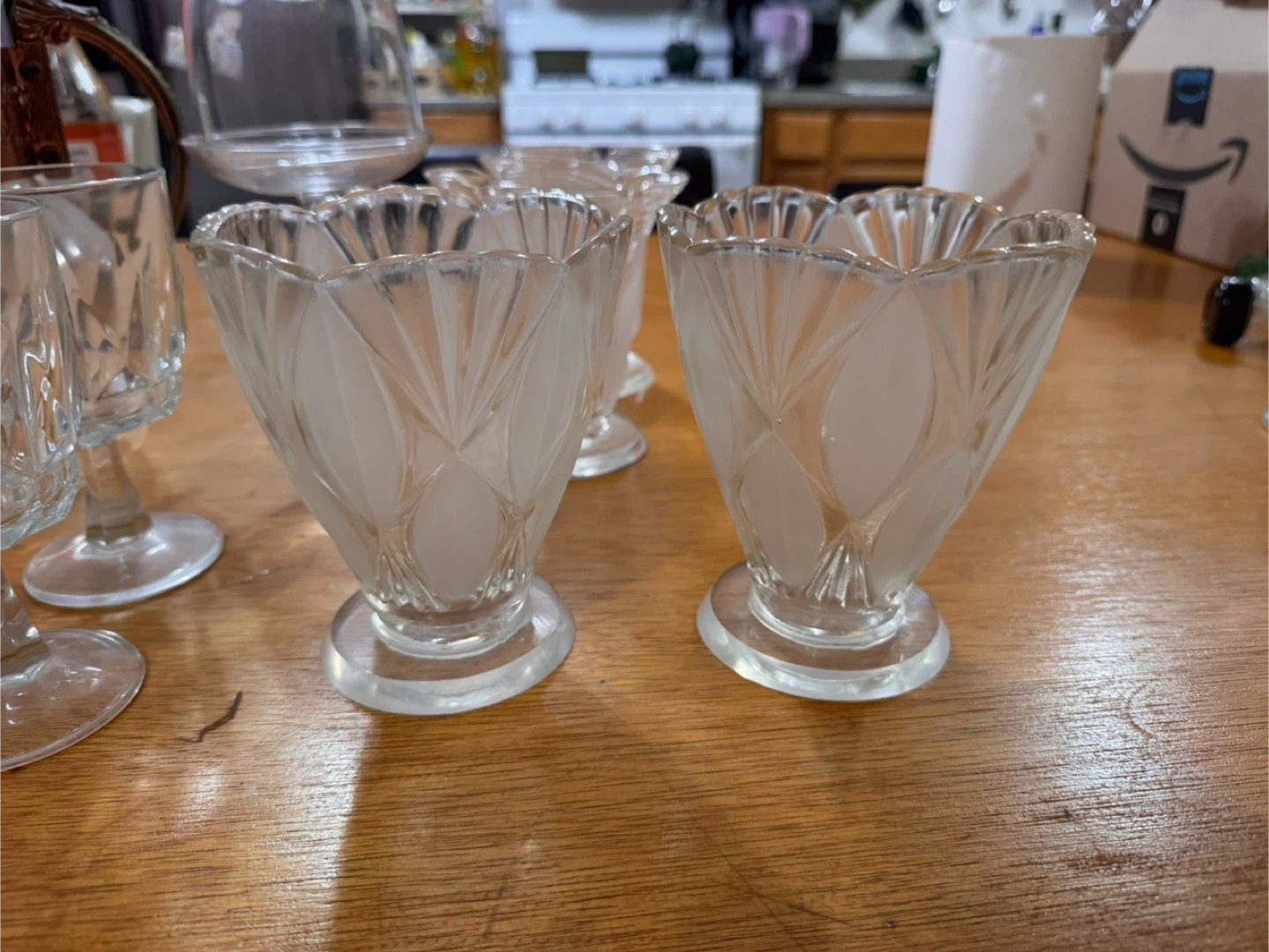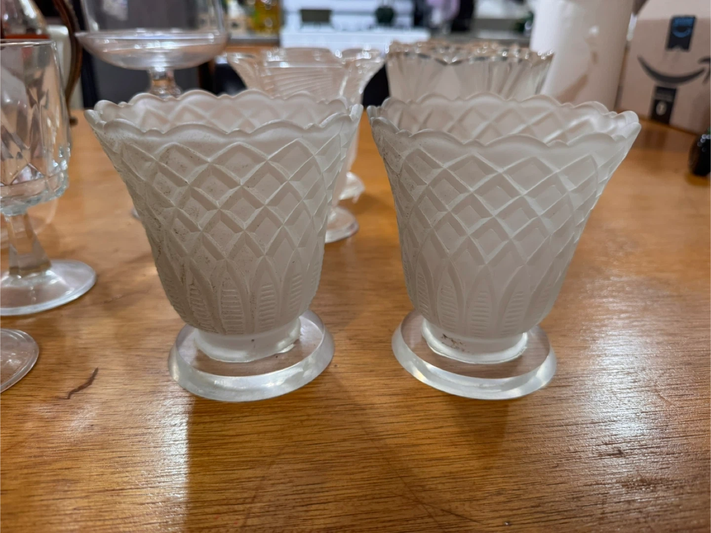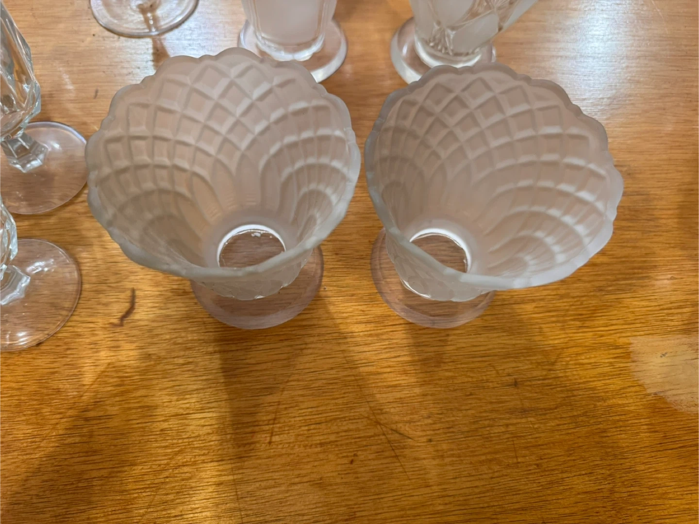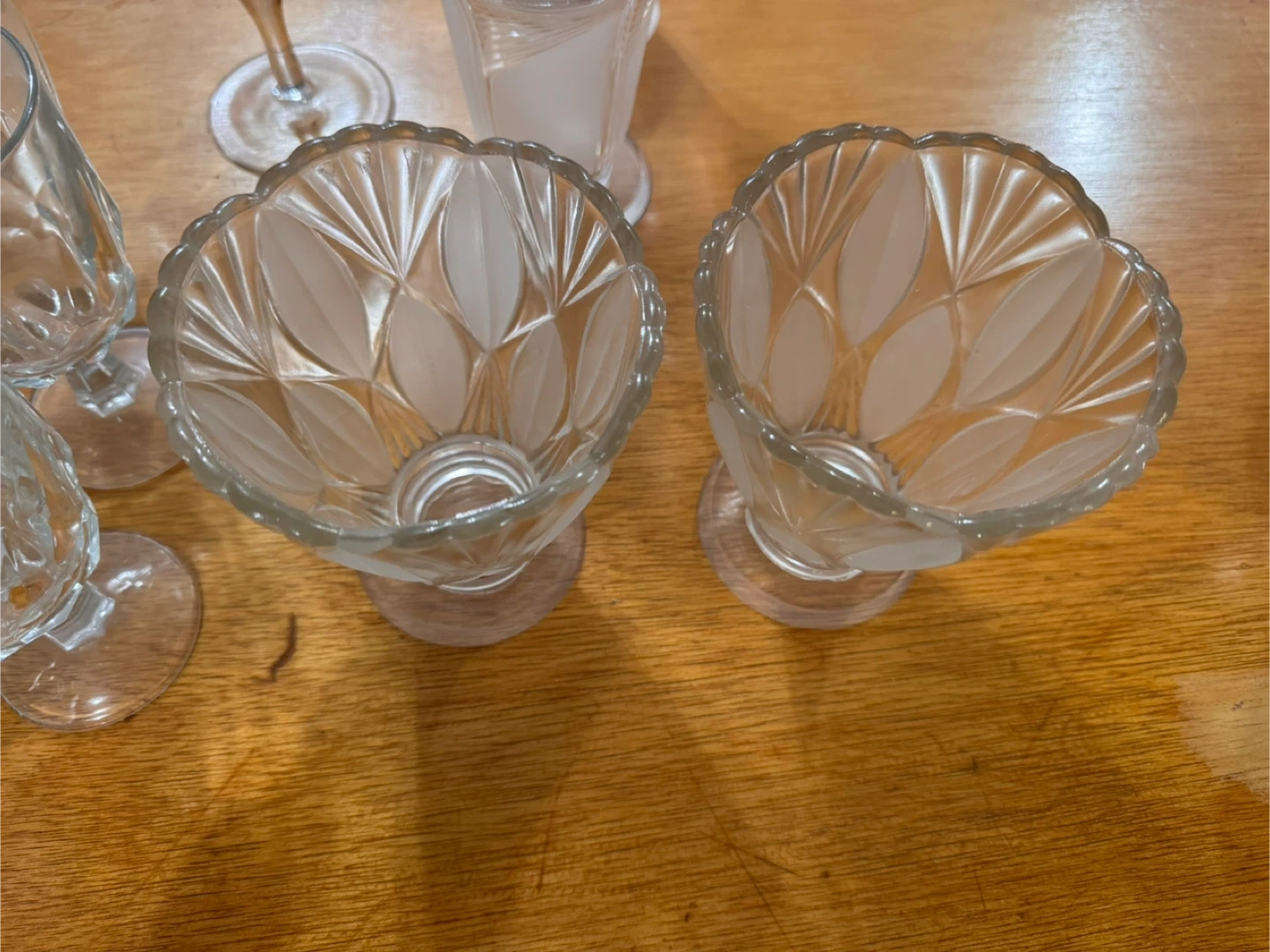 Selling a set of 8 vintage dessert bowls (4 Pairs). They are made of clear glass with a frosted finish. Perfect for ice cream or pudding!