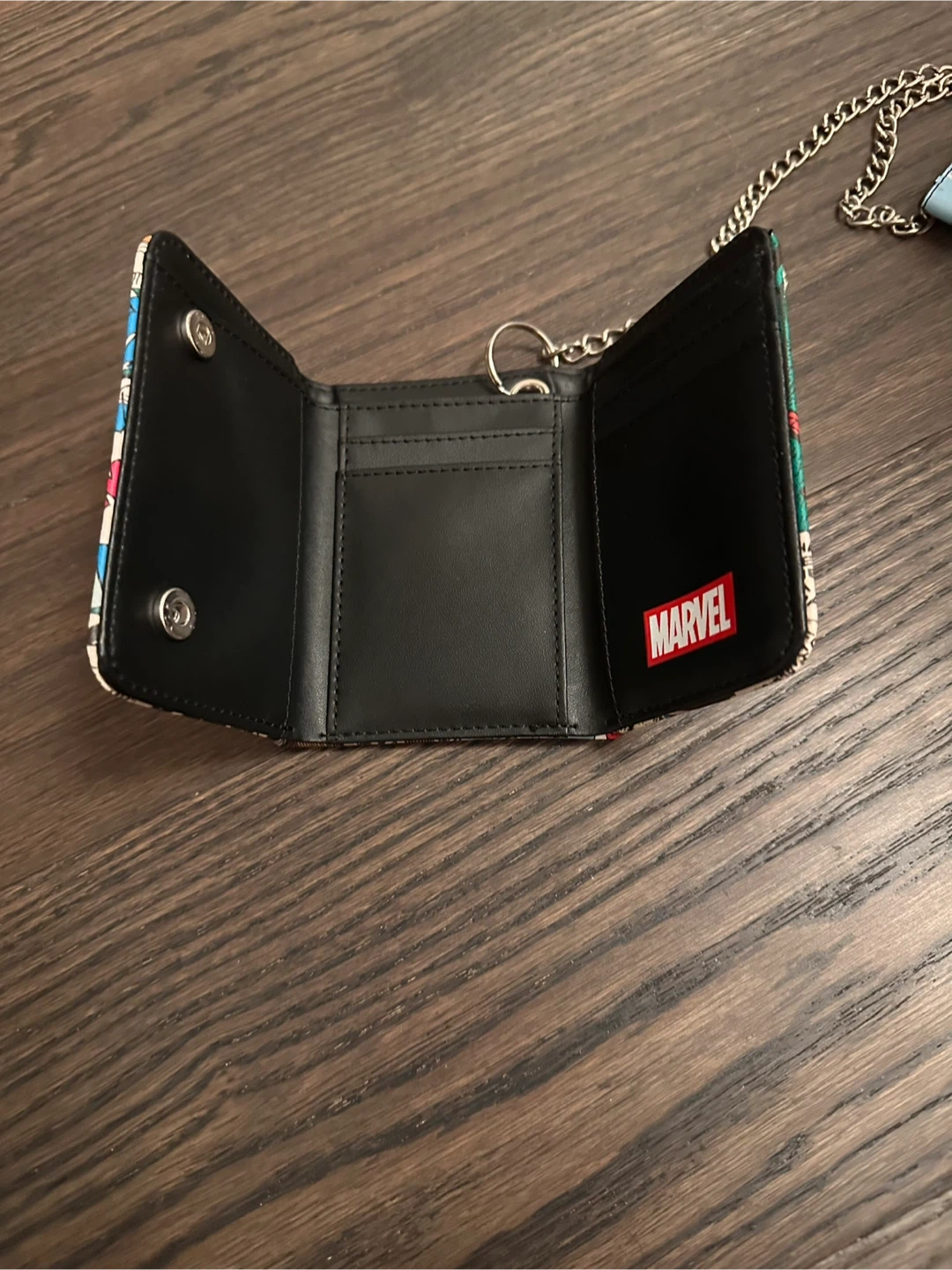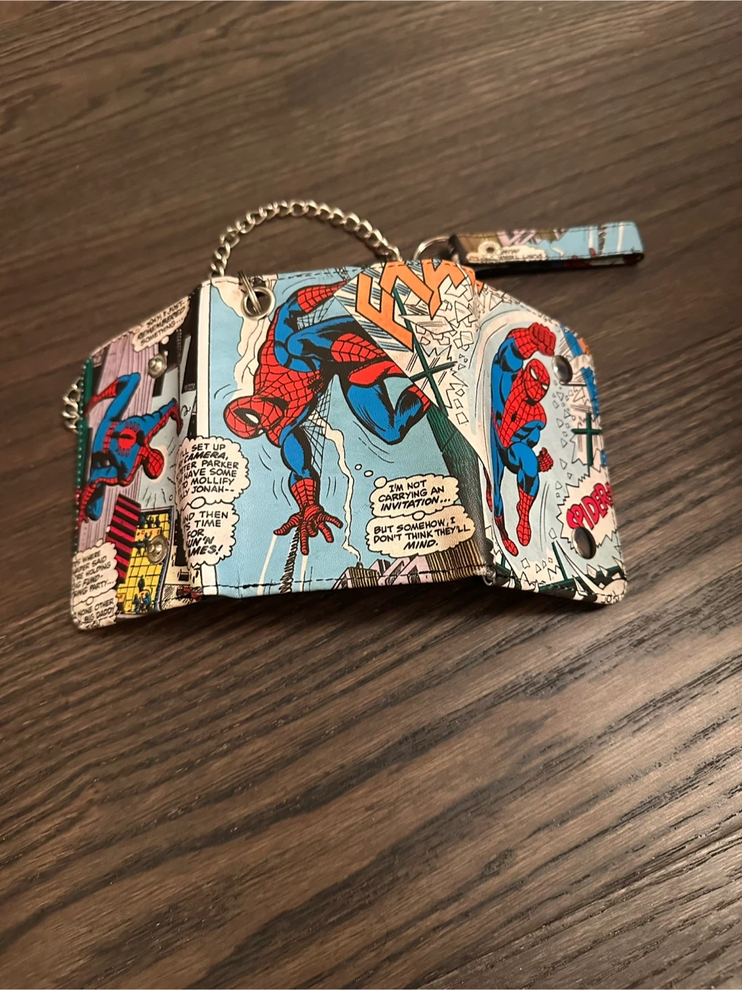 Check out this awesome Spider-Man comic print wallet! It's a tri-fold style with a chain and wrist strap. Perfect for any Marvel fan!