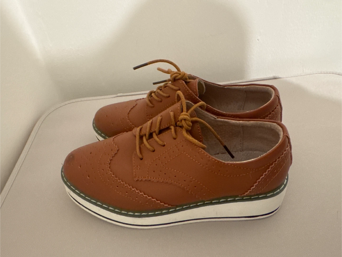 Selling a pair of brown oxford-style shoes. They have a classic lace-up design with decorative perforations. The shoes feature a white platform sole with a thin green stripe, adding a modern touch to the traditional style. They show some signs of wear but are still in good condition for everyday use
