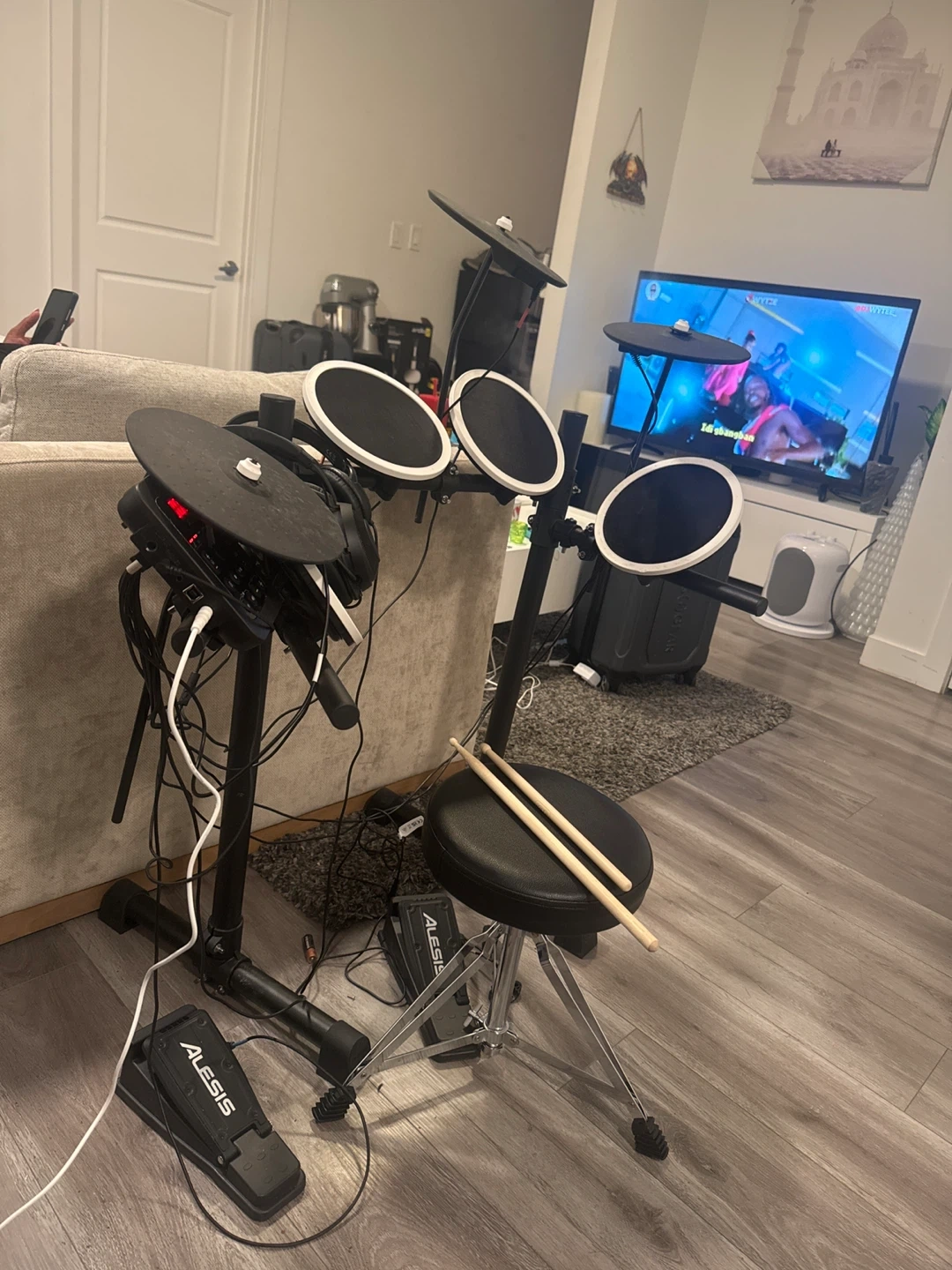 Selling an Alesis electronic drum set. It's in great shape and ready for a new drummer to enjoy! Comes with everything you see in the picture, including the drumsticks and stool
