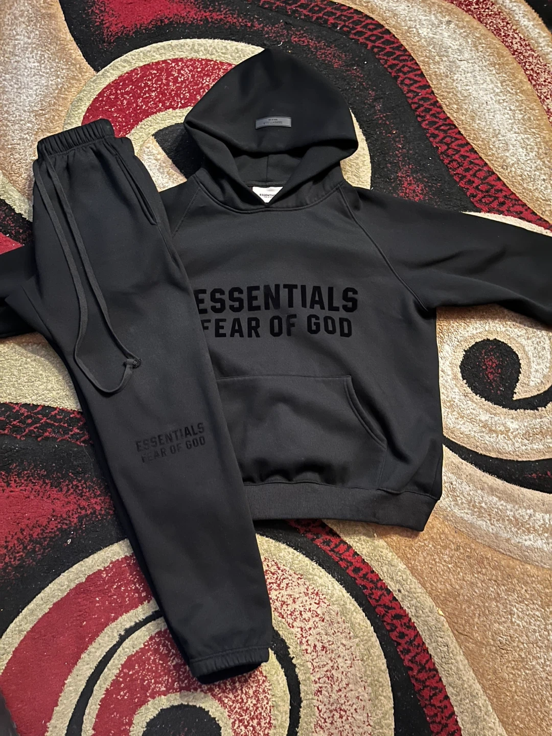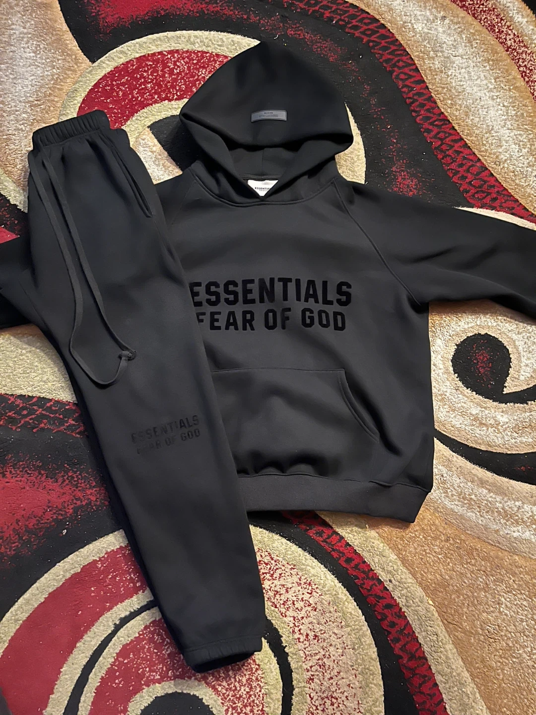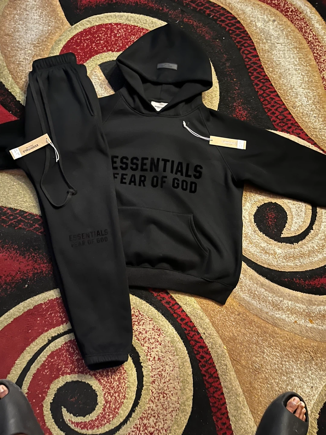 Selling a matching black hoodie and sweatpants set from Essentials Fear of God! The set features the brand's name prominently displayed on both pieces. Perfect for a comfy and stylish look!