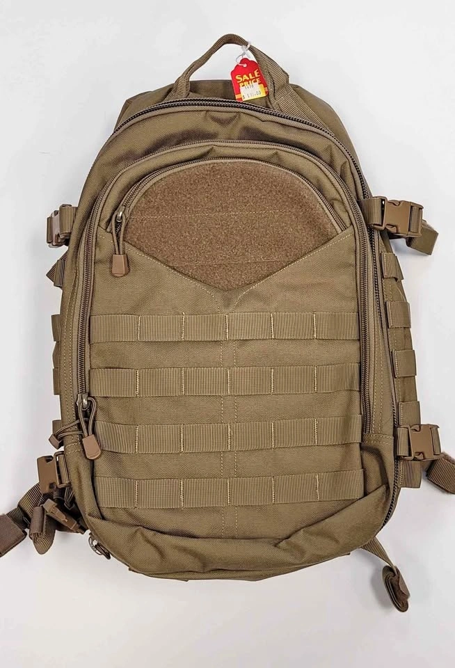 Coyote brown tactical day pack, MOLLE compatible with female velcro to attach patches. Three compartments to hold all your necessary gear for a trip into the concrete jungle or the great wild outdoors. Has waist and chest straps for comfort.