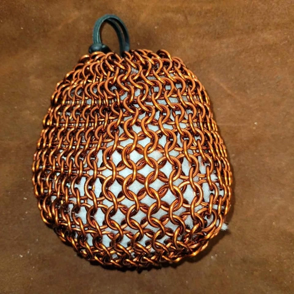 Enameled copper chainmail dice bag with black latigo leather drawstring. Holds dice securely and will last for years of hard-core gaming!