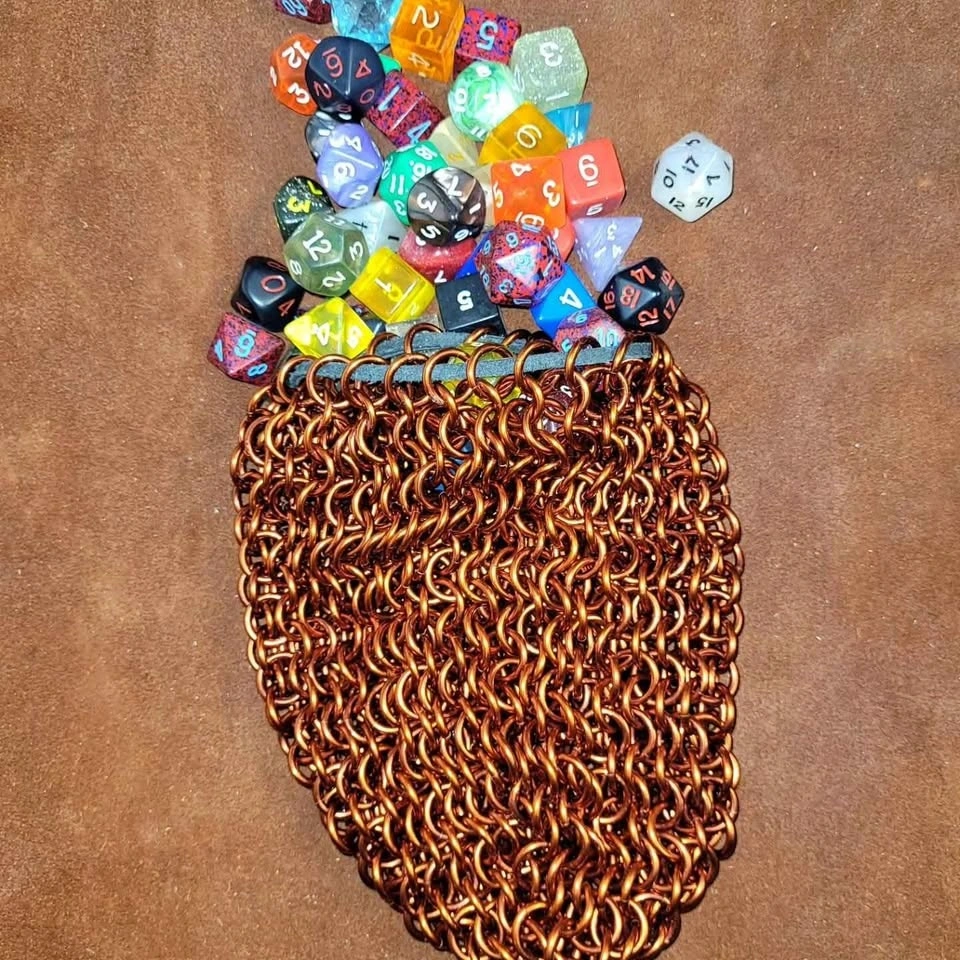 Enameled copper chainmail dice bag with black latigo leather drawstring. Holds dice securely and will last for years of hard-core gaming!