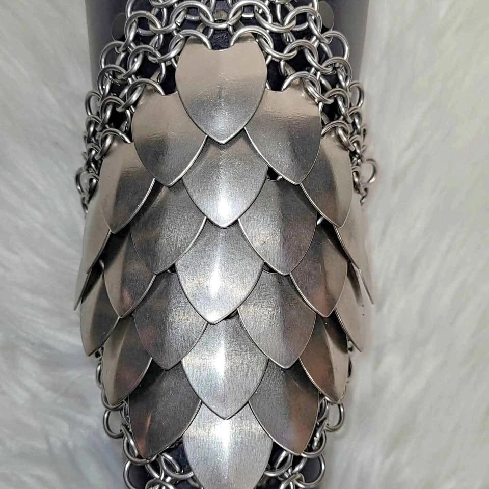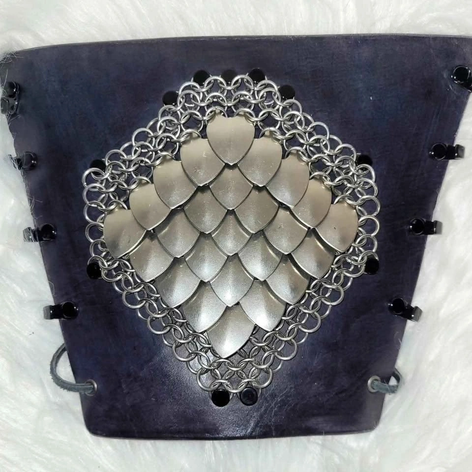 Metal scale bracer with black leather backing. Has metal chain and scale design. Made with silver-toned metal scales and rings. Attached to black leather with metal rivets.