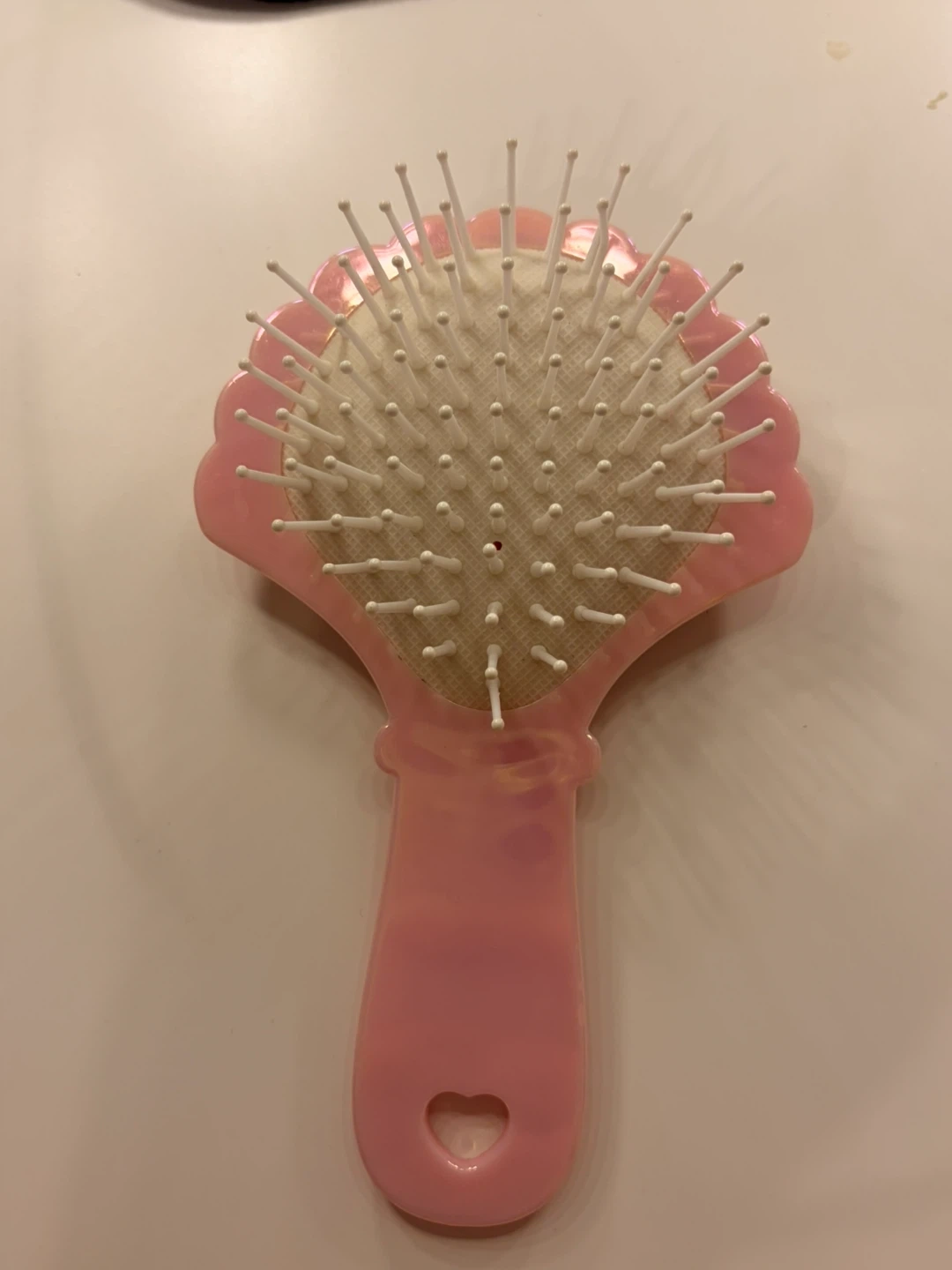 This charming vintage hairbrush is a delightful find, featuring a seashell design with a pearlescent pink finish. It's in good condition, with all bristles intact and ready to add a touch of retro flair to your daily routine.