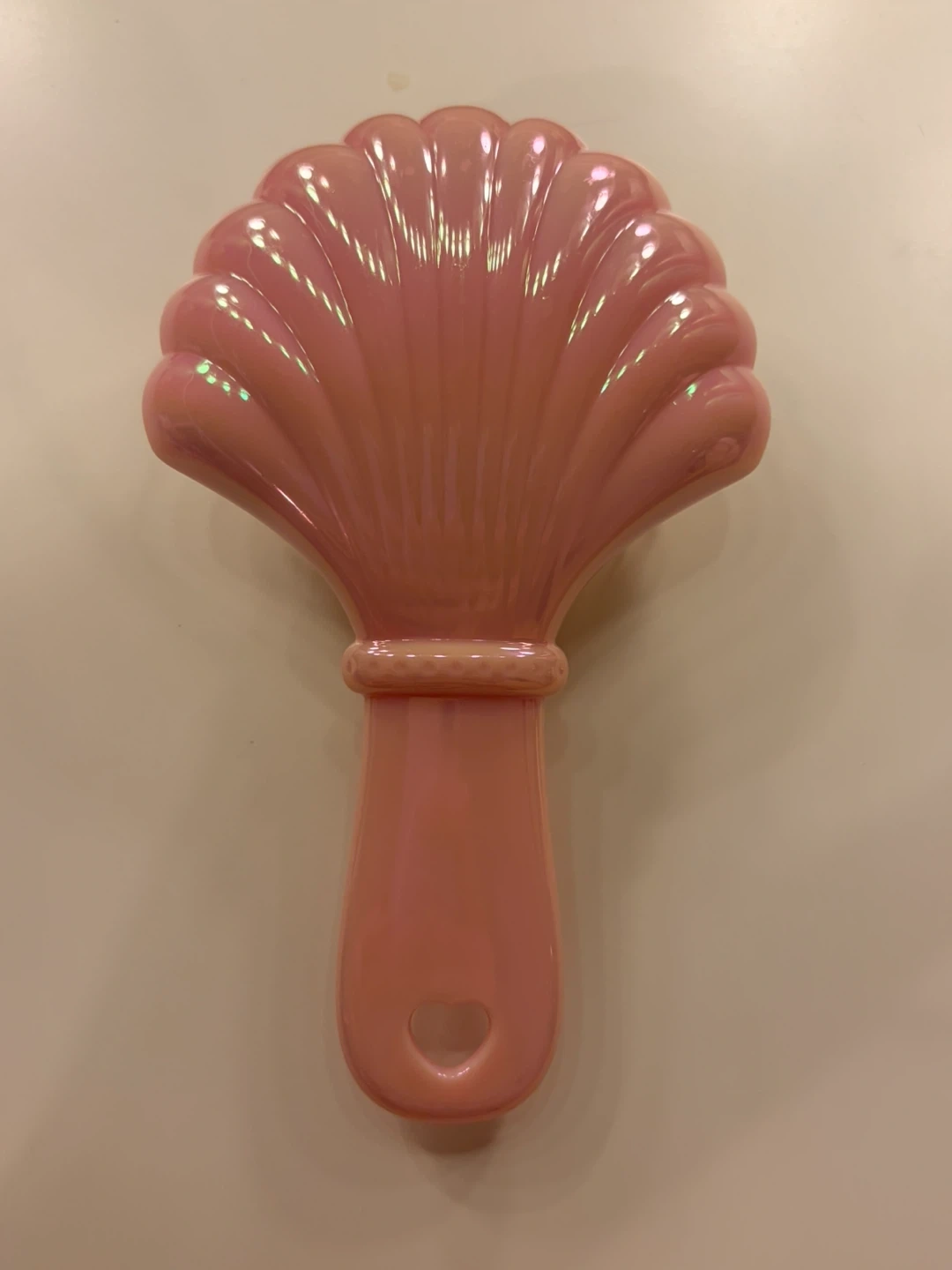 This charming vintage hairbrush is a delightful find, featuring a seashell design with a pearlescent pink finish. It's in good condition, with all bristles intact and ready to add a touch of retro flair to your daily routine.