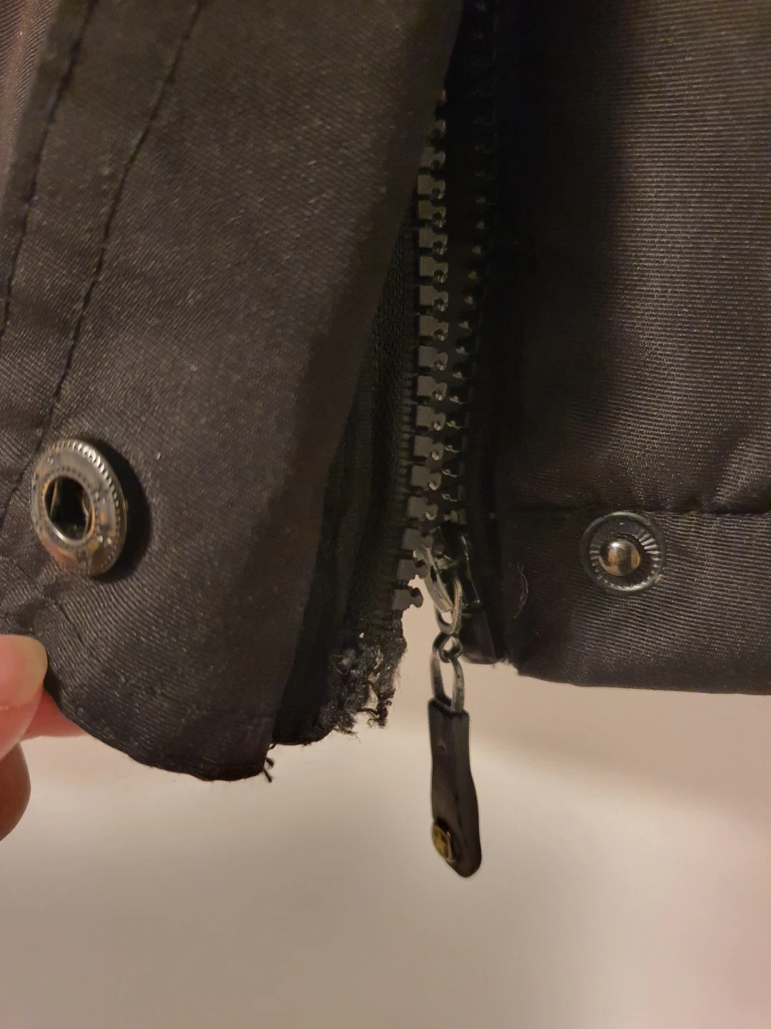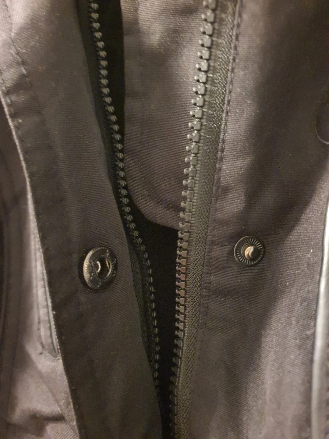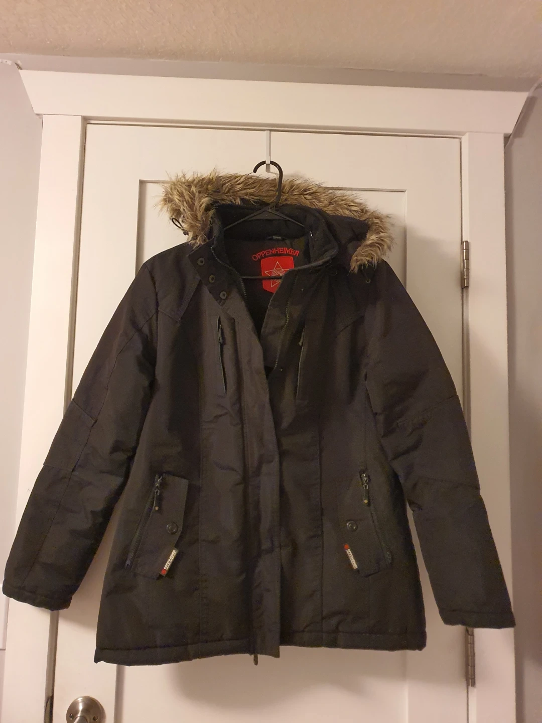 Selling an Oppenheimer black winter coat in size L. It's in great condition and ready for the Canada cold weather! The coat features a faux fur hood and a stylish design. Needs to fix the zipper but it has buttons. See pictures for reference.