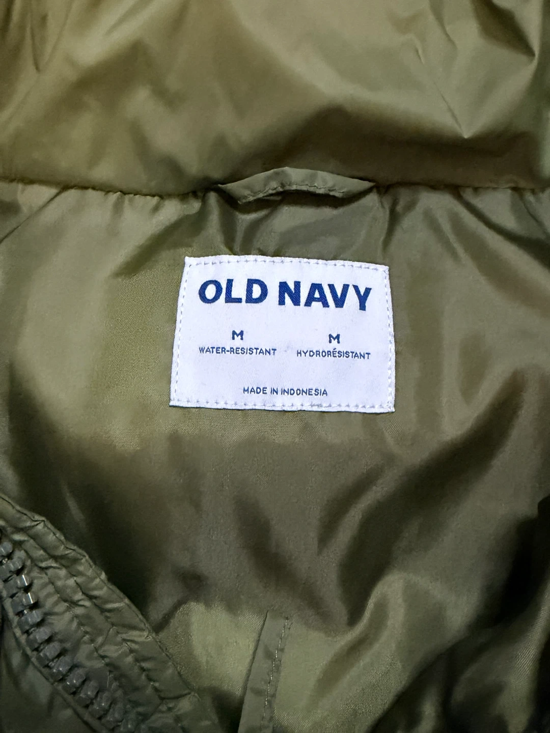 Here's an Old Navy puffer vest in a size medium! It's a nice olive green colour and is water-resistant. Perfect for layering during the cooler months