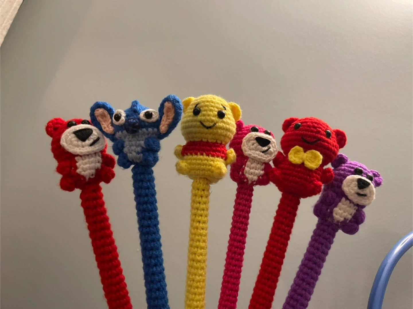 Selling these adorable handmade crochet pencil toppers! They feature various characters like Lotso, Winnie the Pooh, and Stitch. Perfect for adding a bit of fun to your school or work supplies