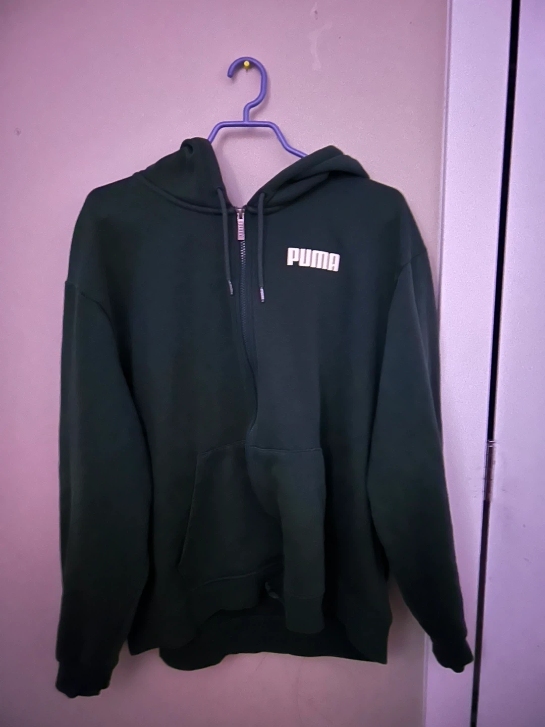 Selling a Puma hoodie in a nice green colour. It has a zipper and a hood, perfect for those cooler days. The Puma logo is displayed on the front and back of the hoodie