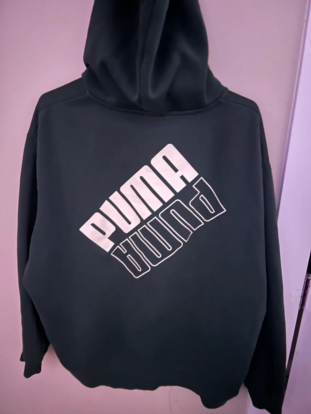 Selling a Puma hoodie in a nice green colour. It has a zipper and a hood, perfect for those cooler days. The Puma logo is displayed on the front and back of the hoodie