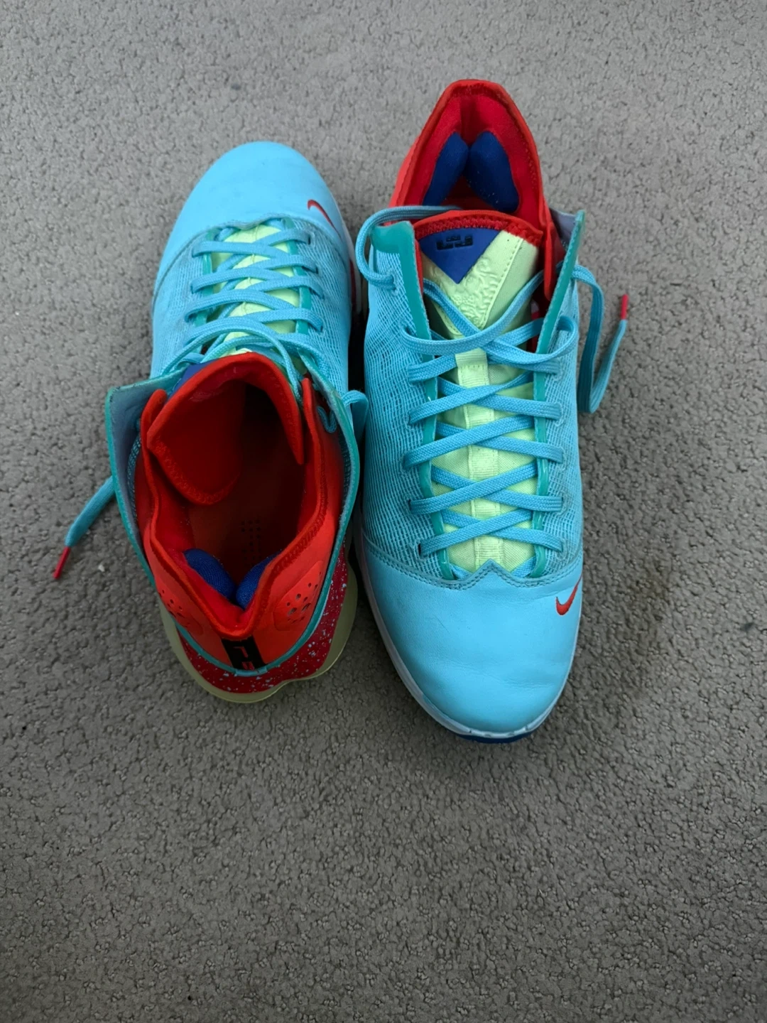 Selling a pair of Nike LeBron 17 Low basketball shoes. They feature a light blue, red, and yellow color scheme. Perfect for playing on the court or casual wear!