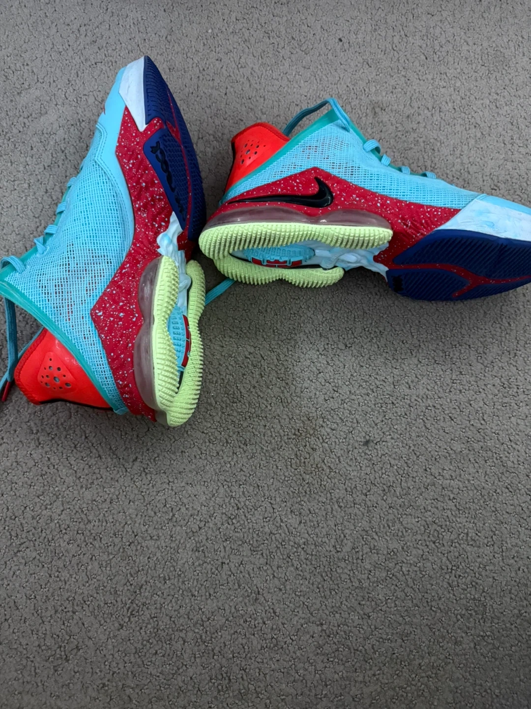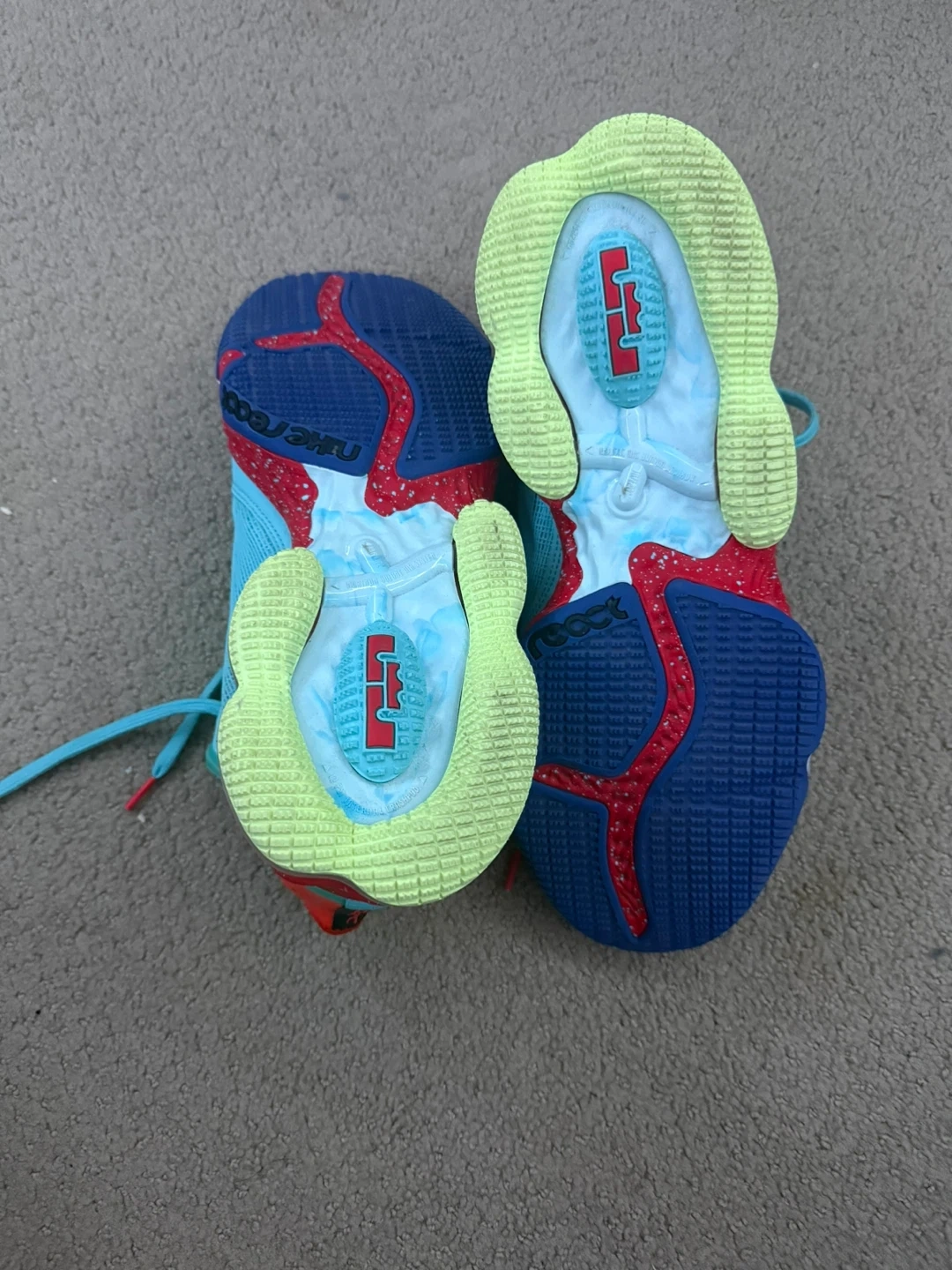 Selling a pair of Nike LeBron 17 Low basketball shoes. They feature a light blue, red, and yellow color scheme. Perfect for playing on the court or casual wear!