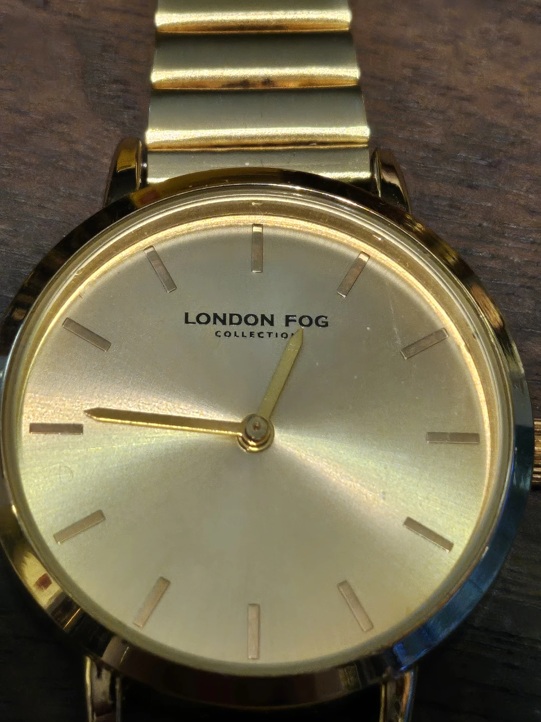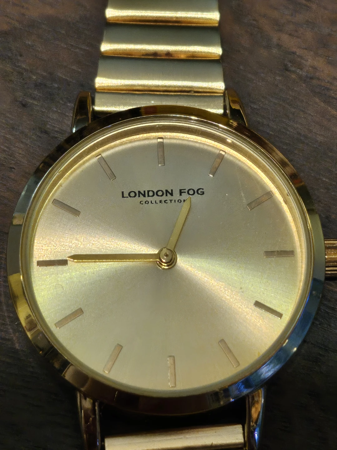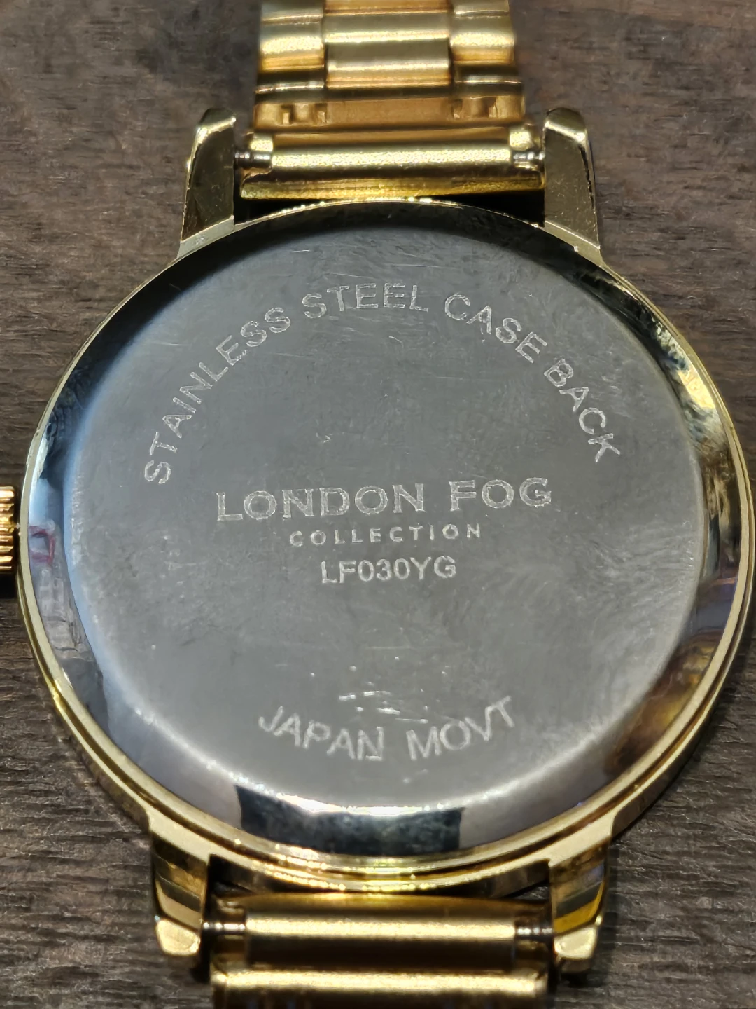 Selling a London Fog Collection watch in gold. The case back is stainless steel. The model number is LF030YG. It has a Japan movement and never worn