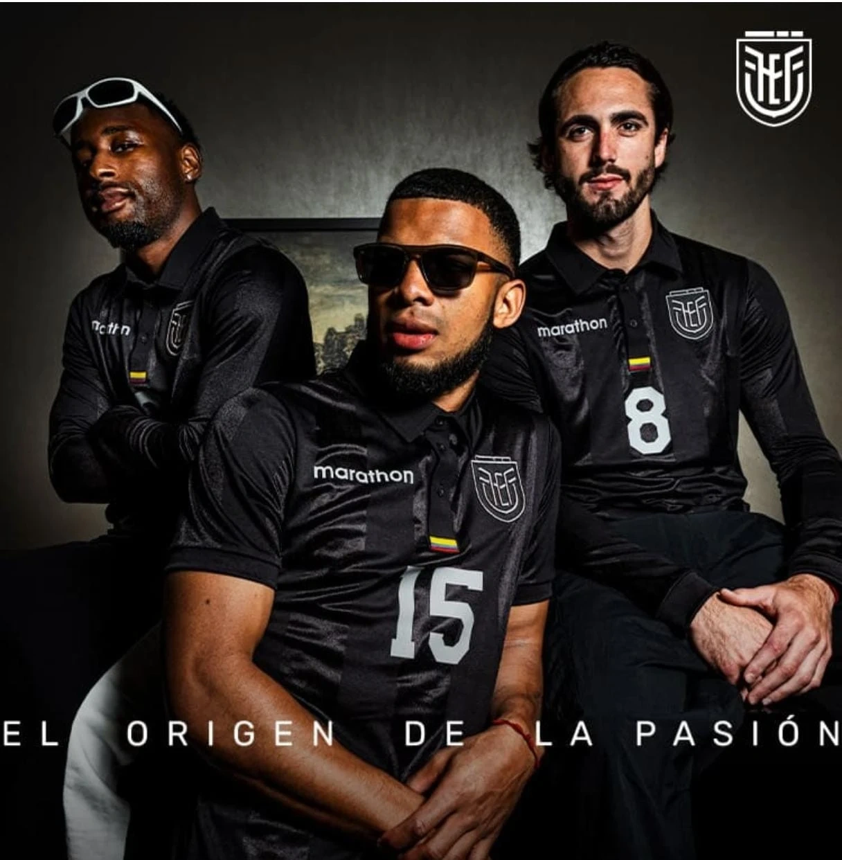 Selling a Marathon Ecuador National Team jersey. It's black with the Ecuador Football Federation (FEF) logo and the Marathon logo. Numbers are visible on some of the jerseys.