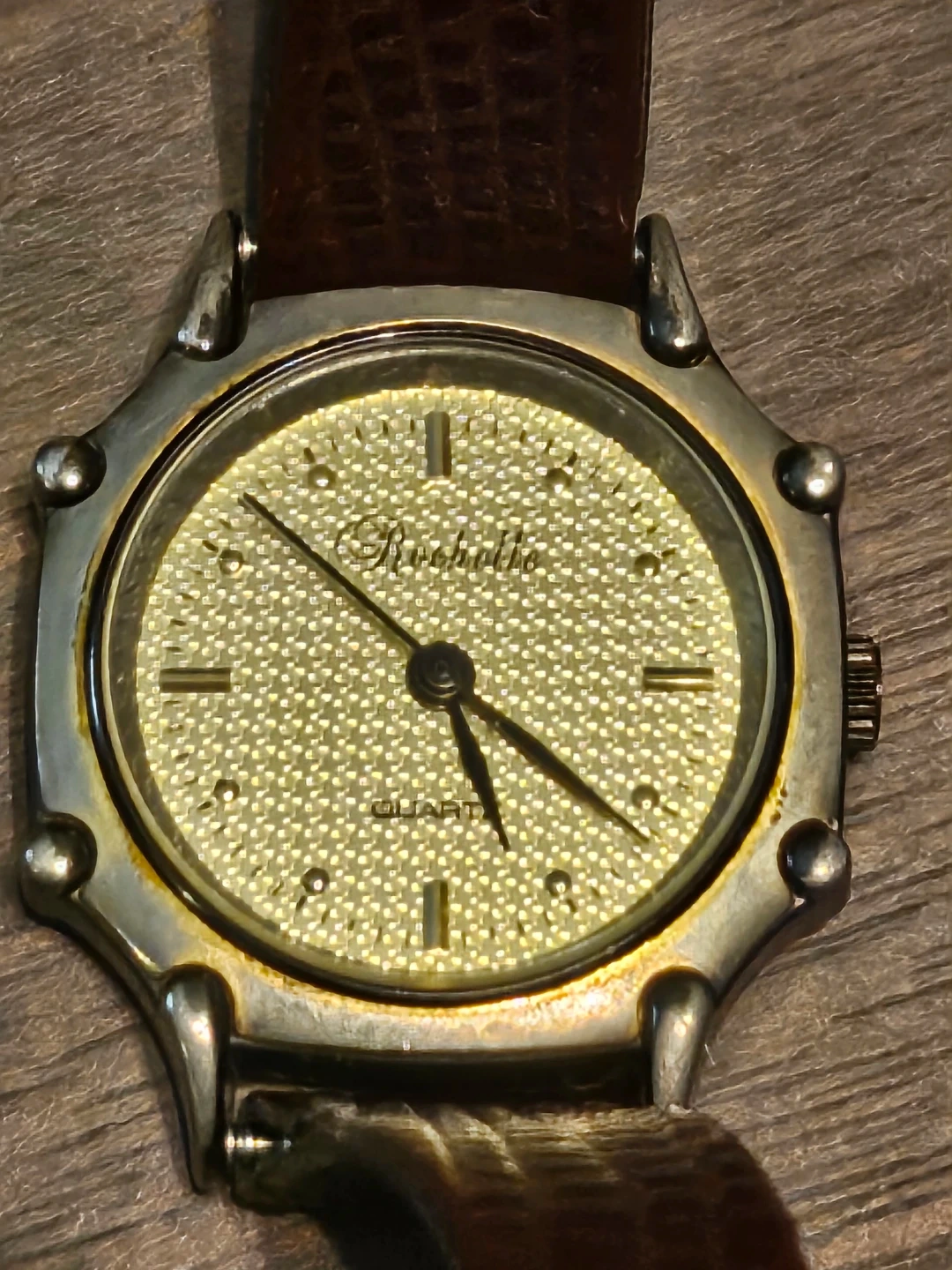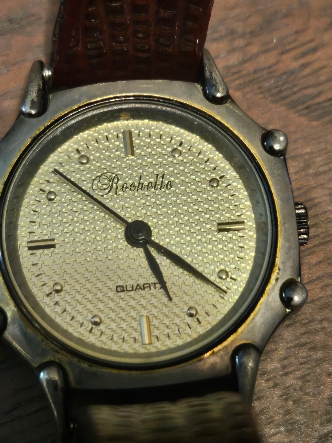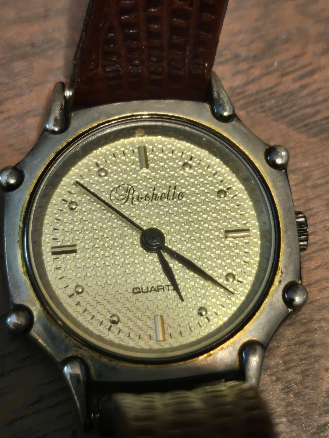 Selling a Rochelle Quartz watch. It features a brown leather strap and a gold-tone face. The watch is in good condition and ready to wear! It's a stylish and classic timepiece that would make a great addition to any collection