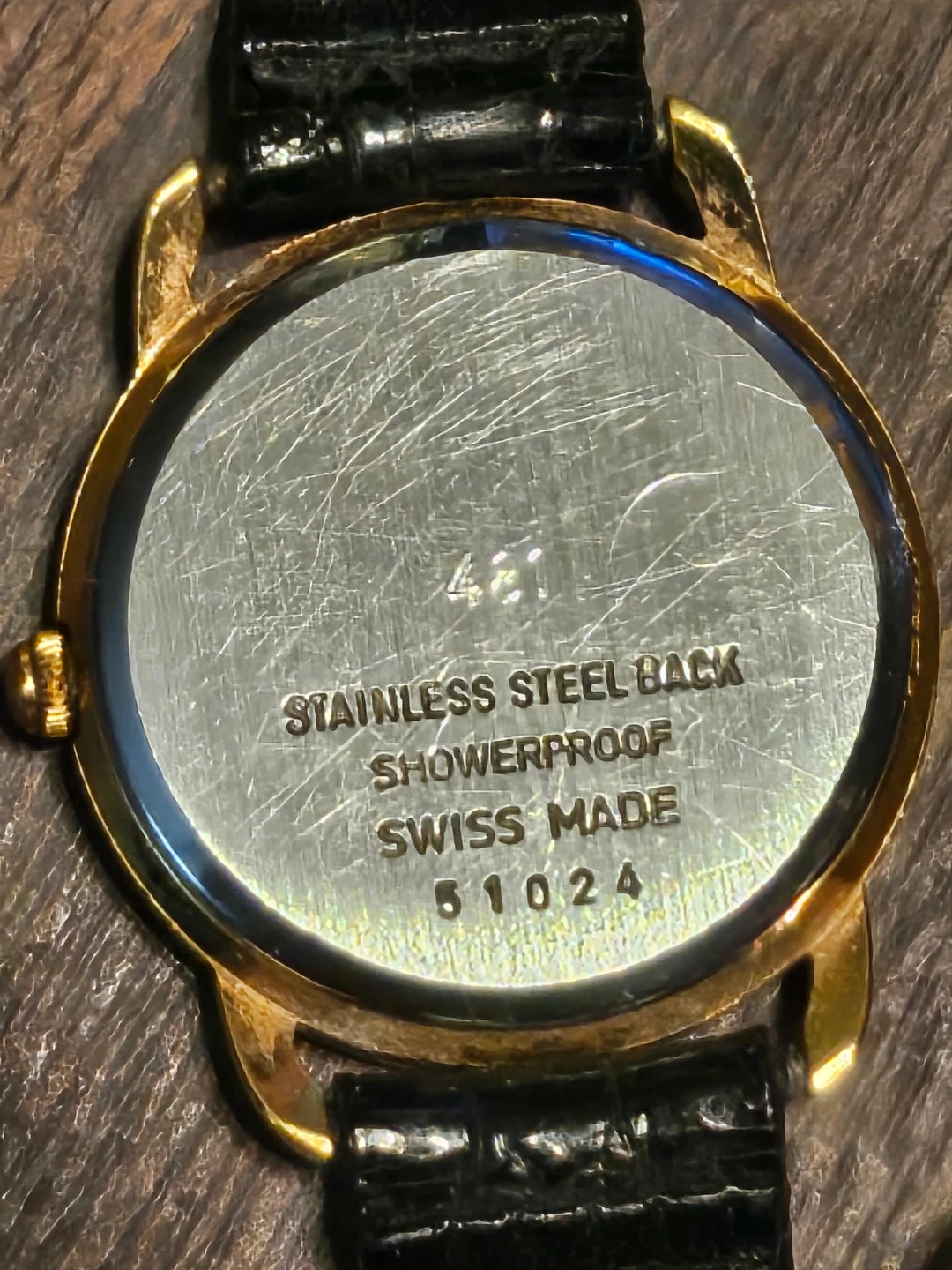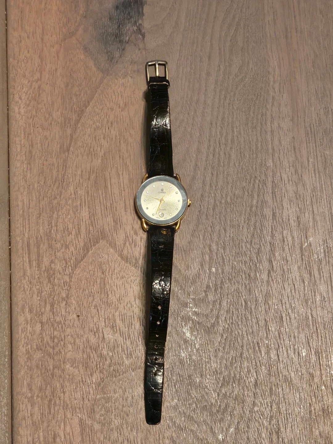 Selling a Christ Quartz ladies watch. It features a gold-tone case with a black leather strap. The dial is silver-toned with crystal hour markers and a date window at the 6 o'clock position. The back is stainless steel and says 'Swiss Made'. $40 obo