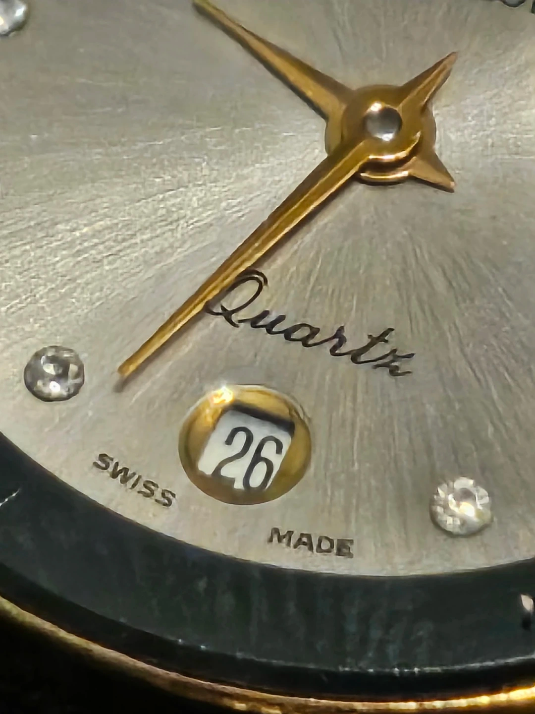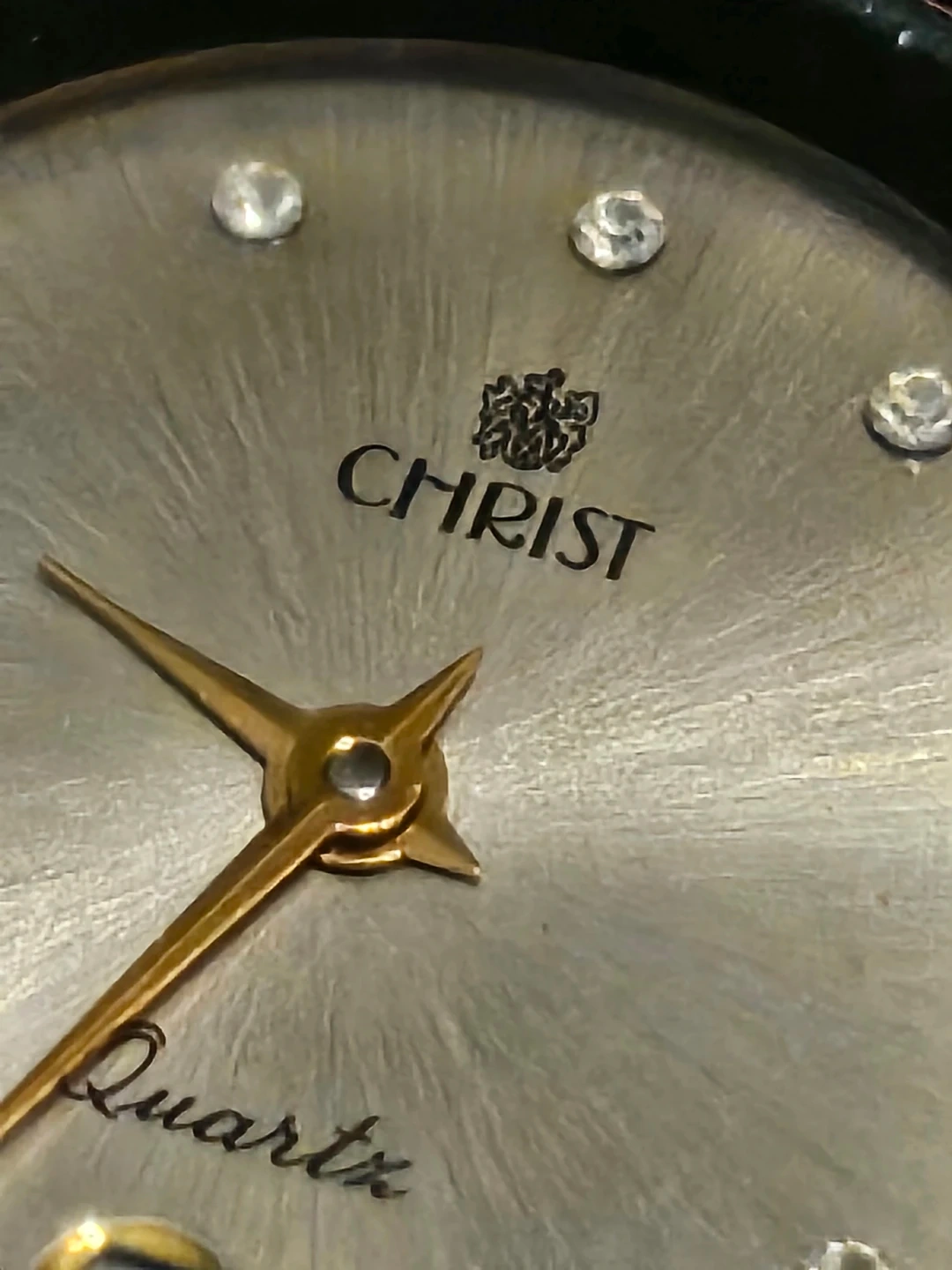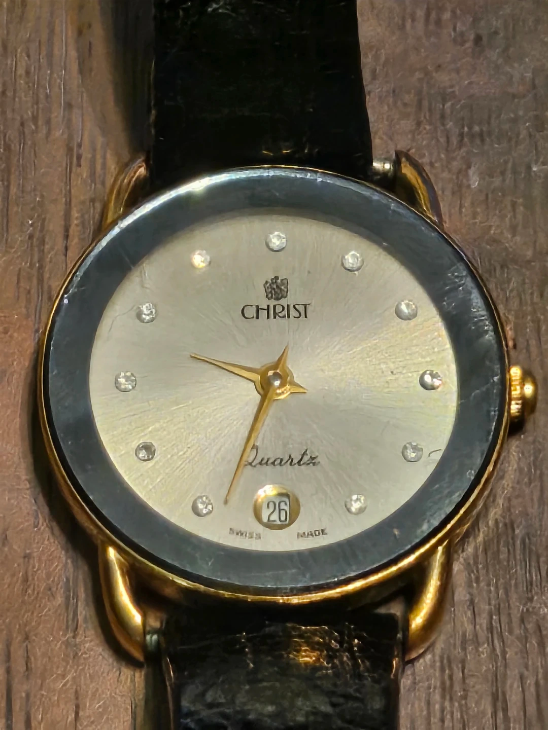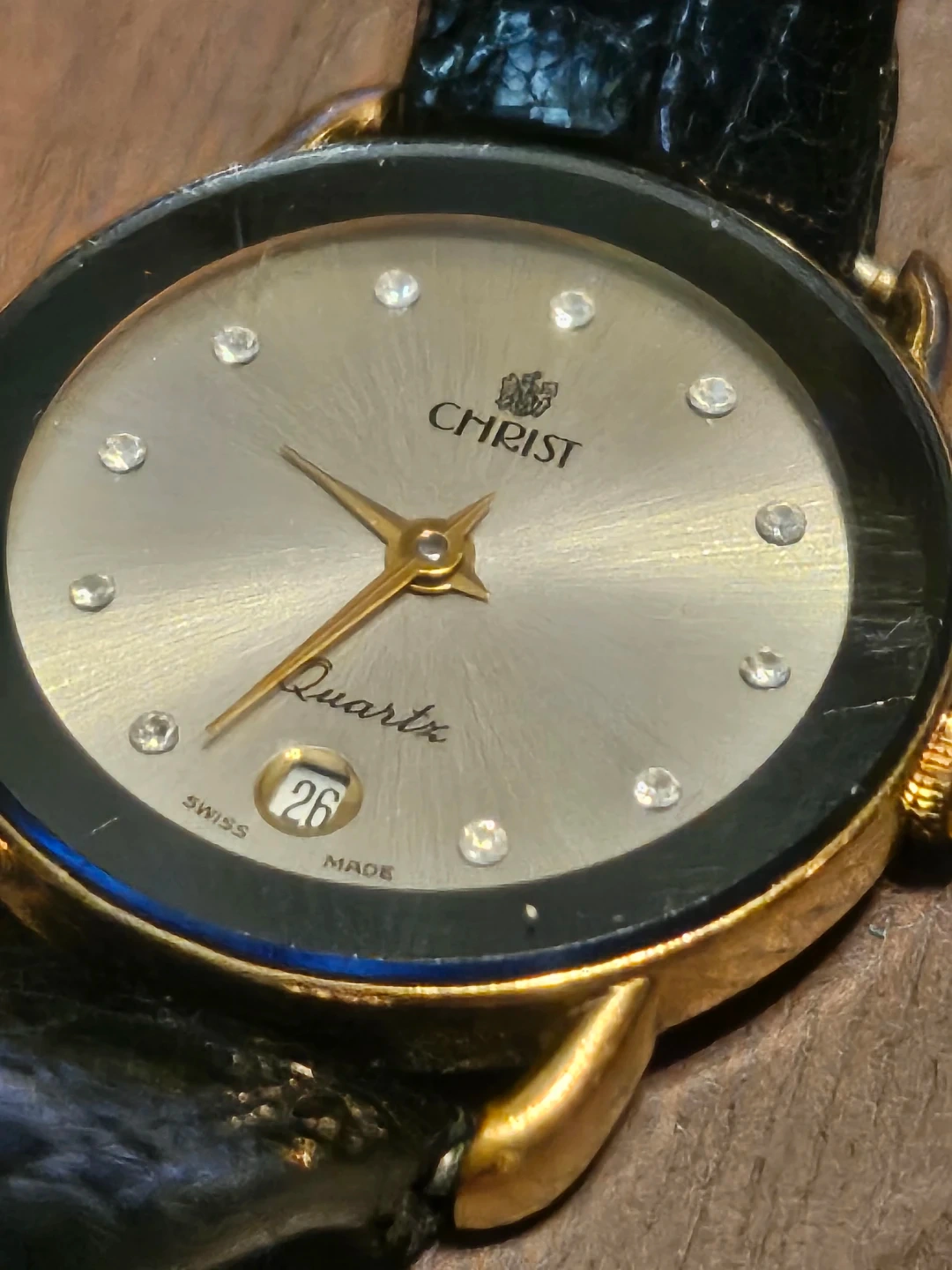 Selling a Christ Quartz ladies watch. It features a gold-tone case with a black leather strap. The dial is silver-toned with crystal hour markers and a date window at the 6 o'clock position. The back is stainless steel and says 'Swiss Made'. $40 obo