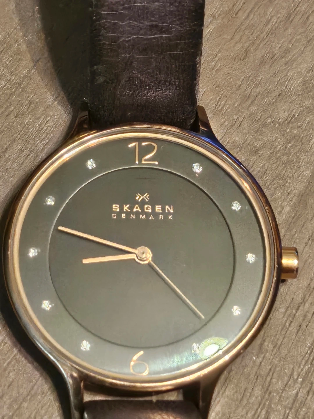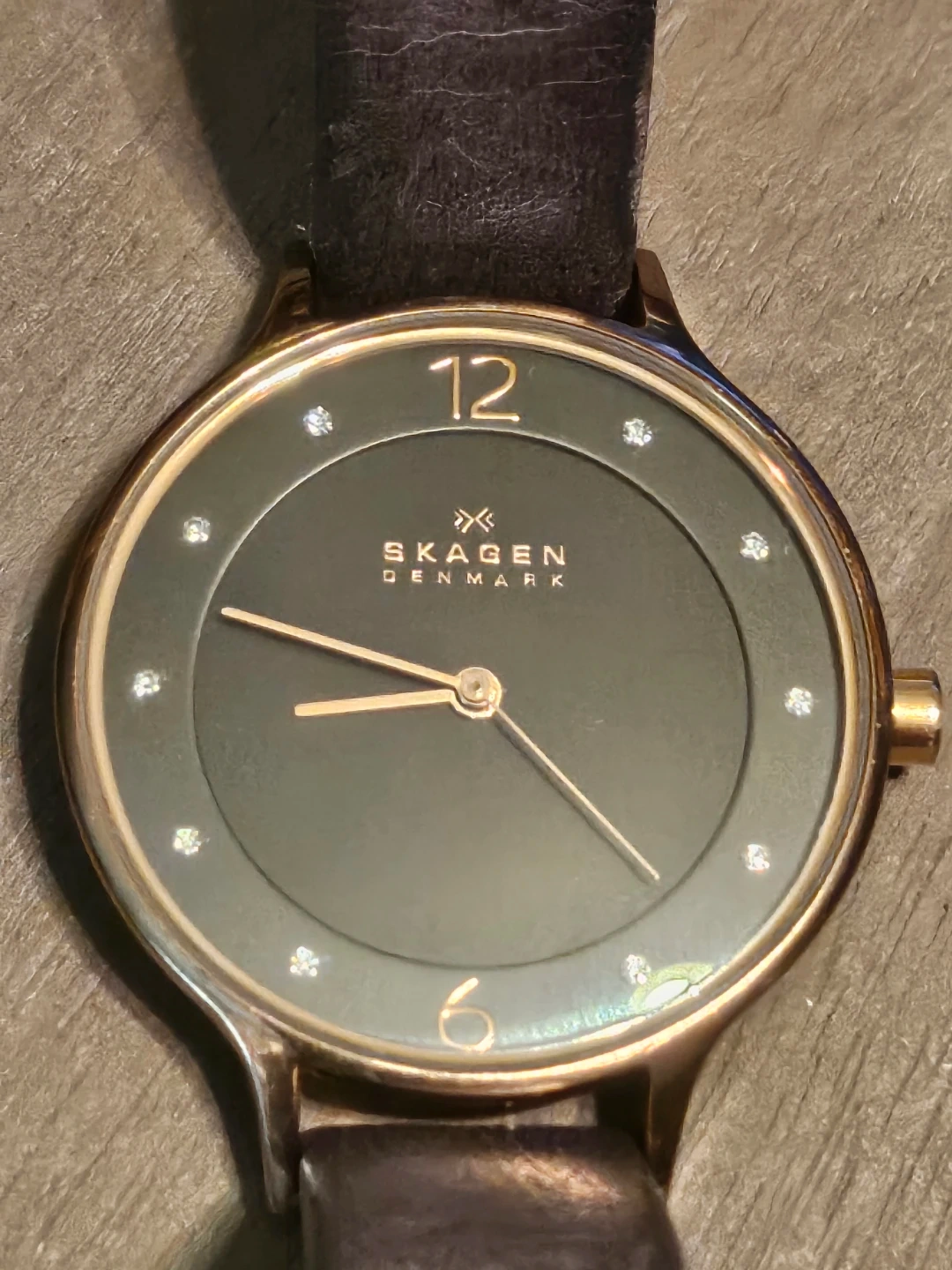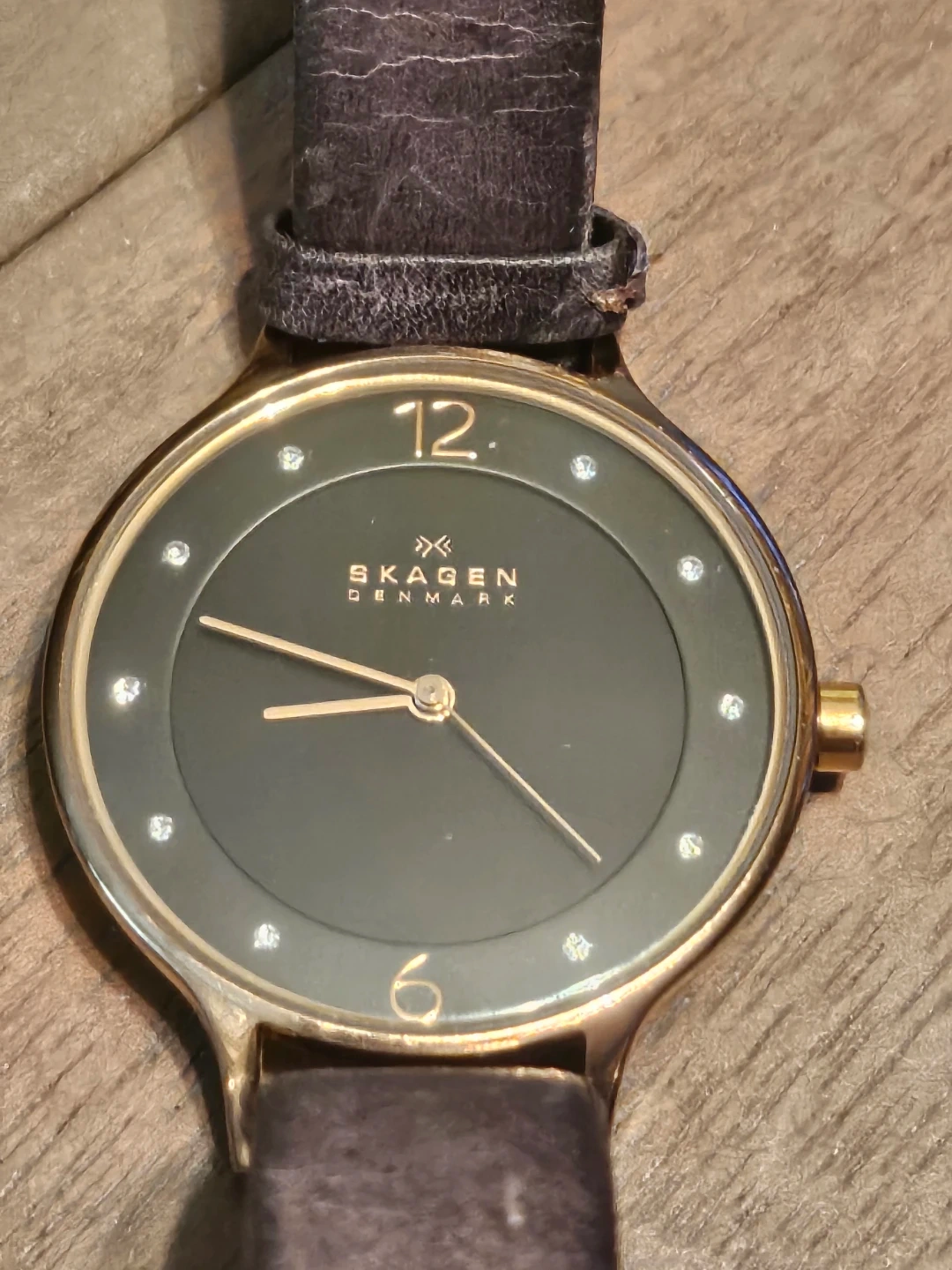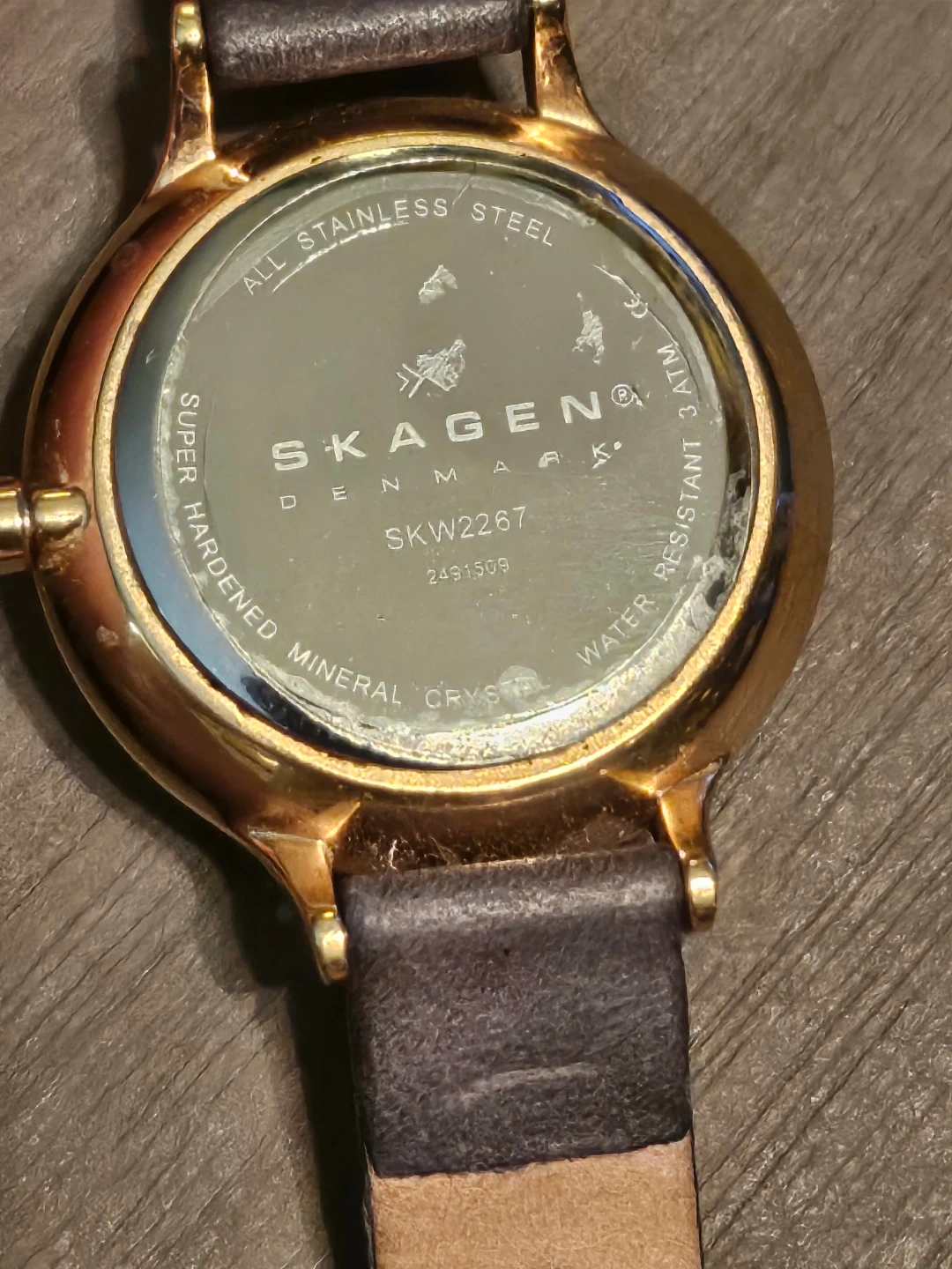 Selling a Skagen Denmark watch, model SKW2267. The band is genuine leather and the back is stainless steel. It's a stylish timepiece!