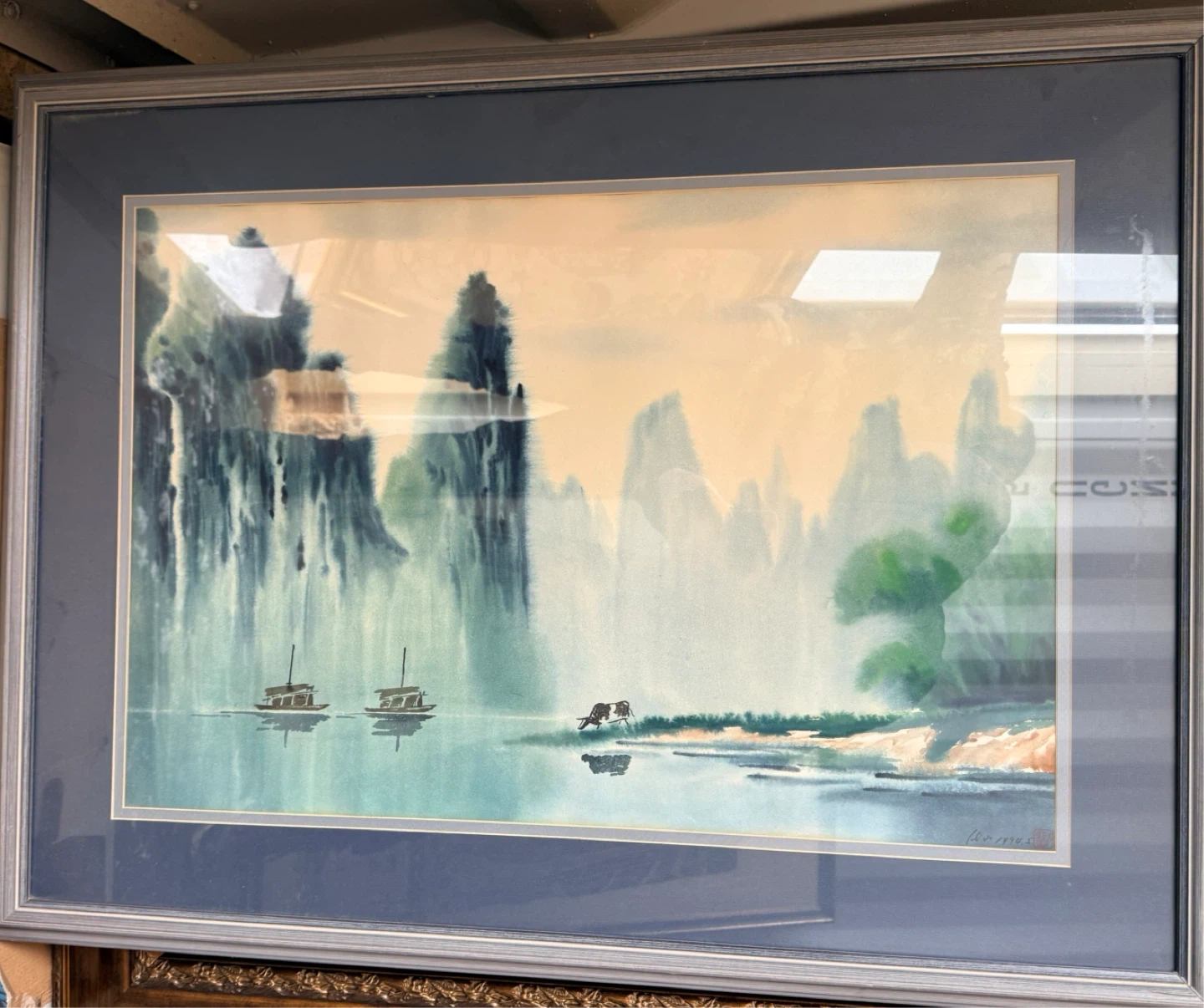 A framed watercolour painting featuring a serene landscape with mountains, water, and boats. The painting is in a silver-tone frame with a navy blue matte.