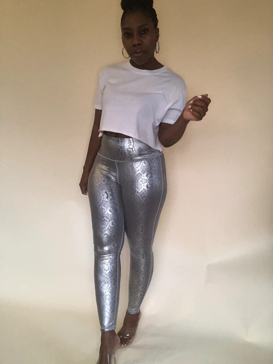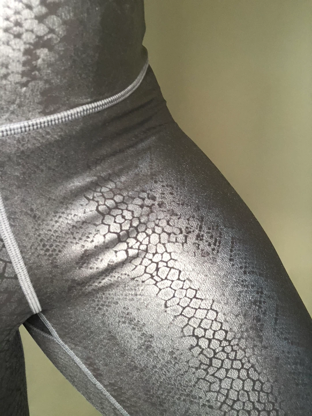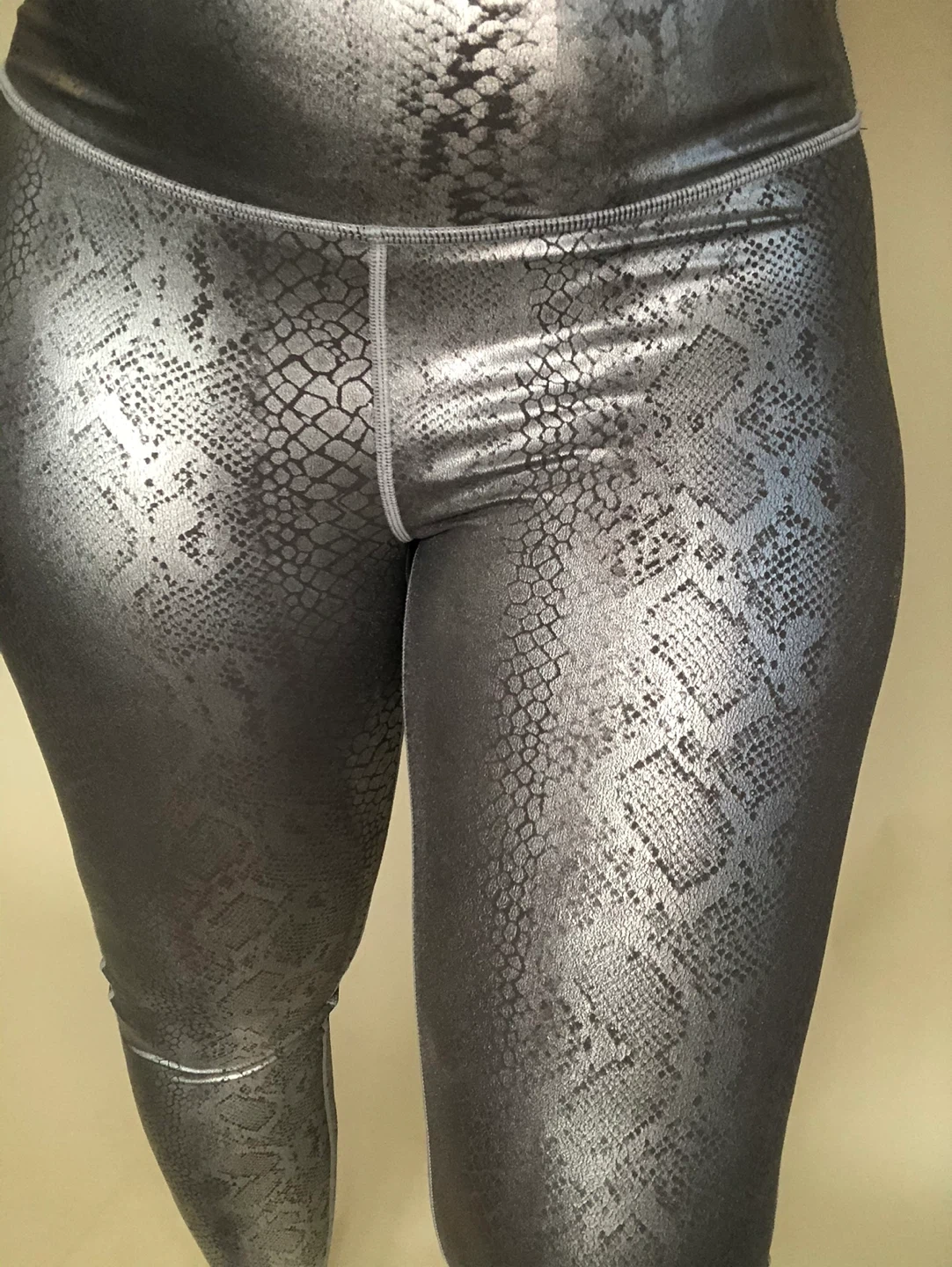These leggings feature a striking silver snake print design!